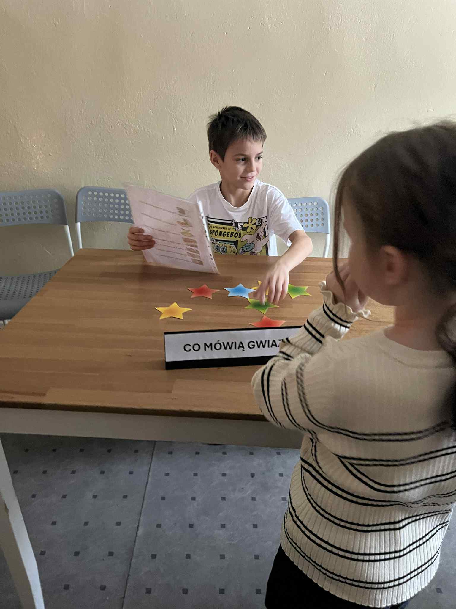 Trzecim stanowiskiem było „Co mówią gwiazdy?”, gdzie uczniowie losowali kolorowe papierowe gwiazdki z różnymi wróżbami i pozytywnymi przesłaniami. Jedno z dzieci pełniło rolę prowadzącego i z uśmiechem przekazywało kolejnym uczestnikom ich „przepowiednie”.