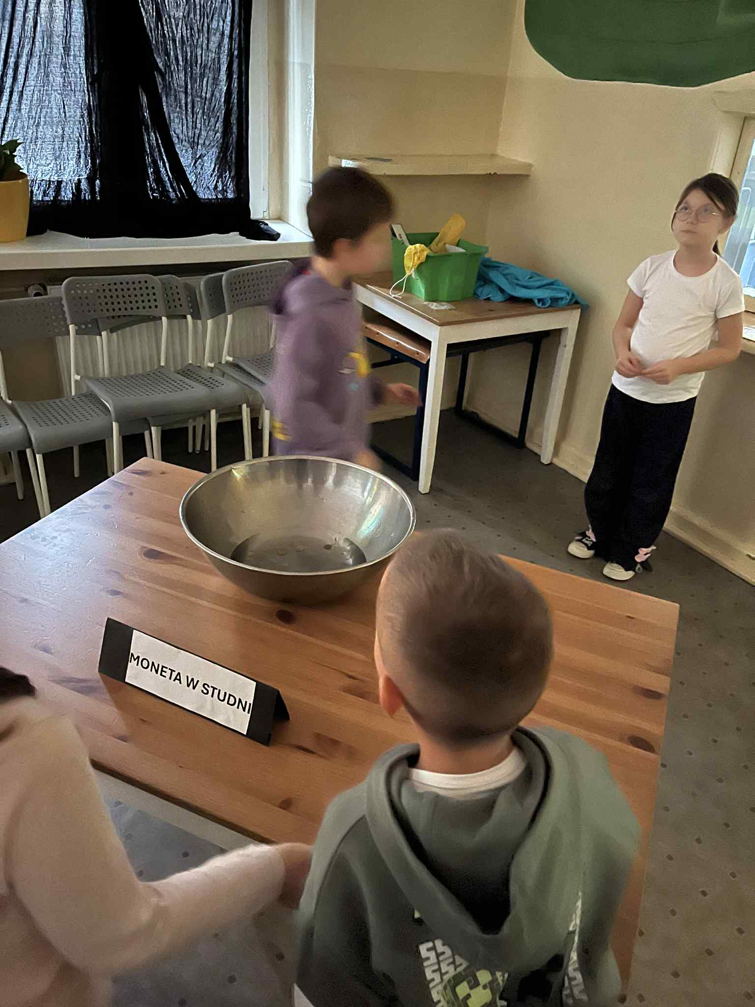 Kolejną atrakcją była „Moneta w studni”, w której uczestnicy wrzucali monetę do metalowej miski z wodą, wypowiadając po cichu swoje marzenia. Zabawa przyciągała szczególnie młodsze dzieci, które z przejęciem czekały na moment wrzucenia monety.