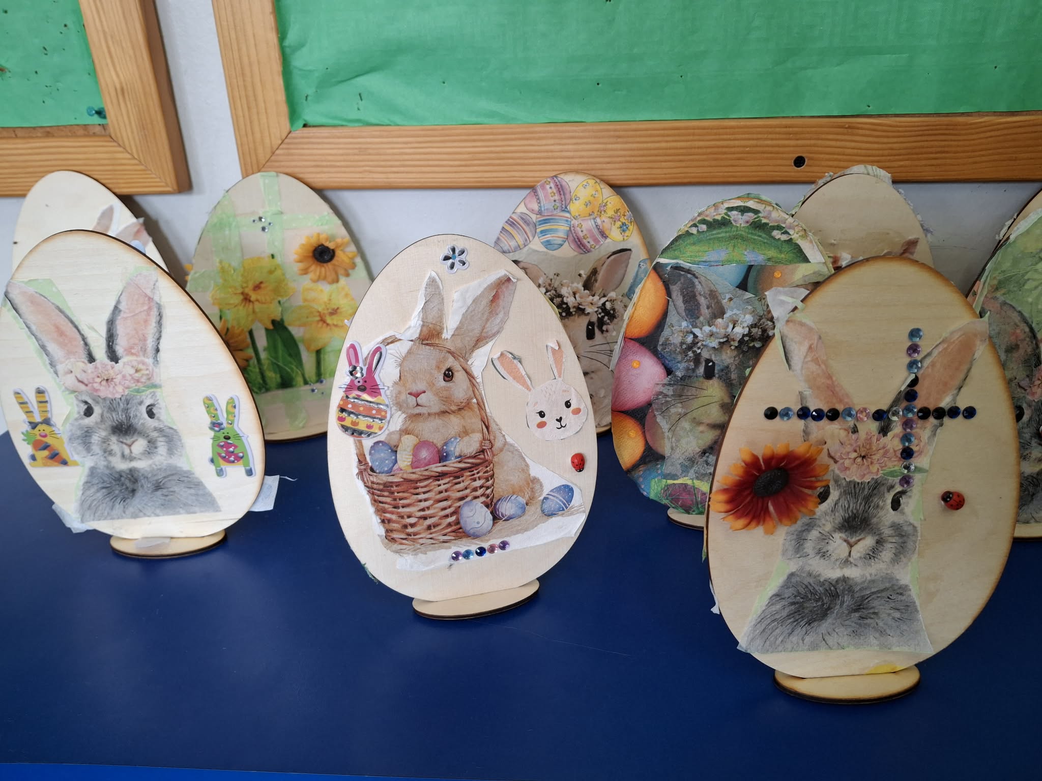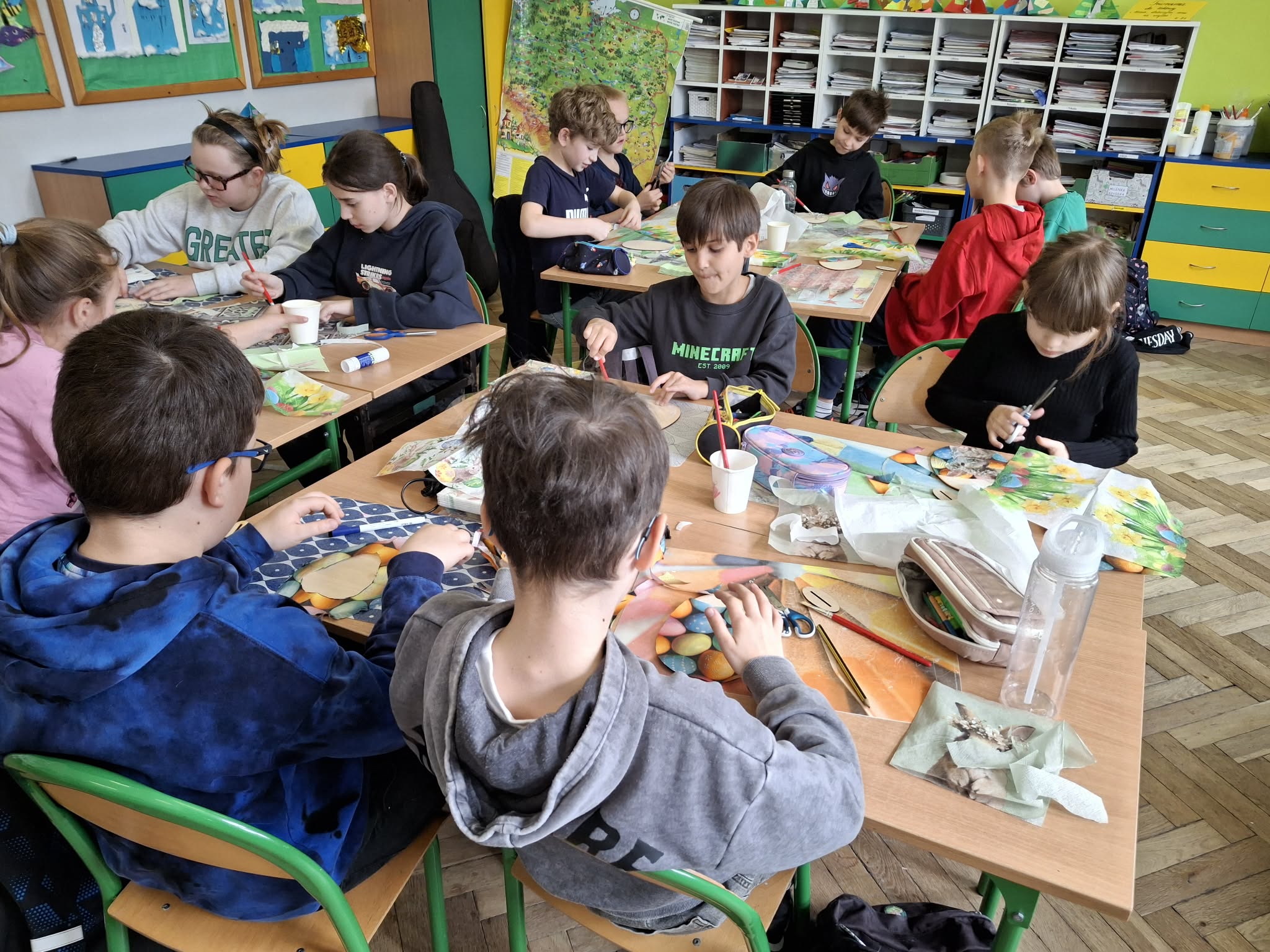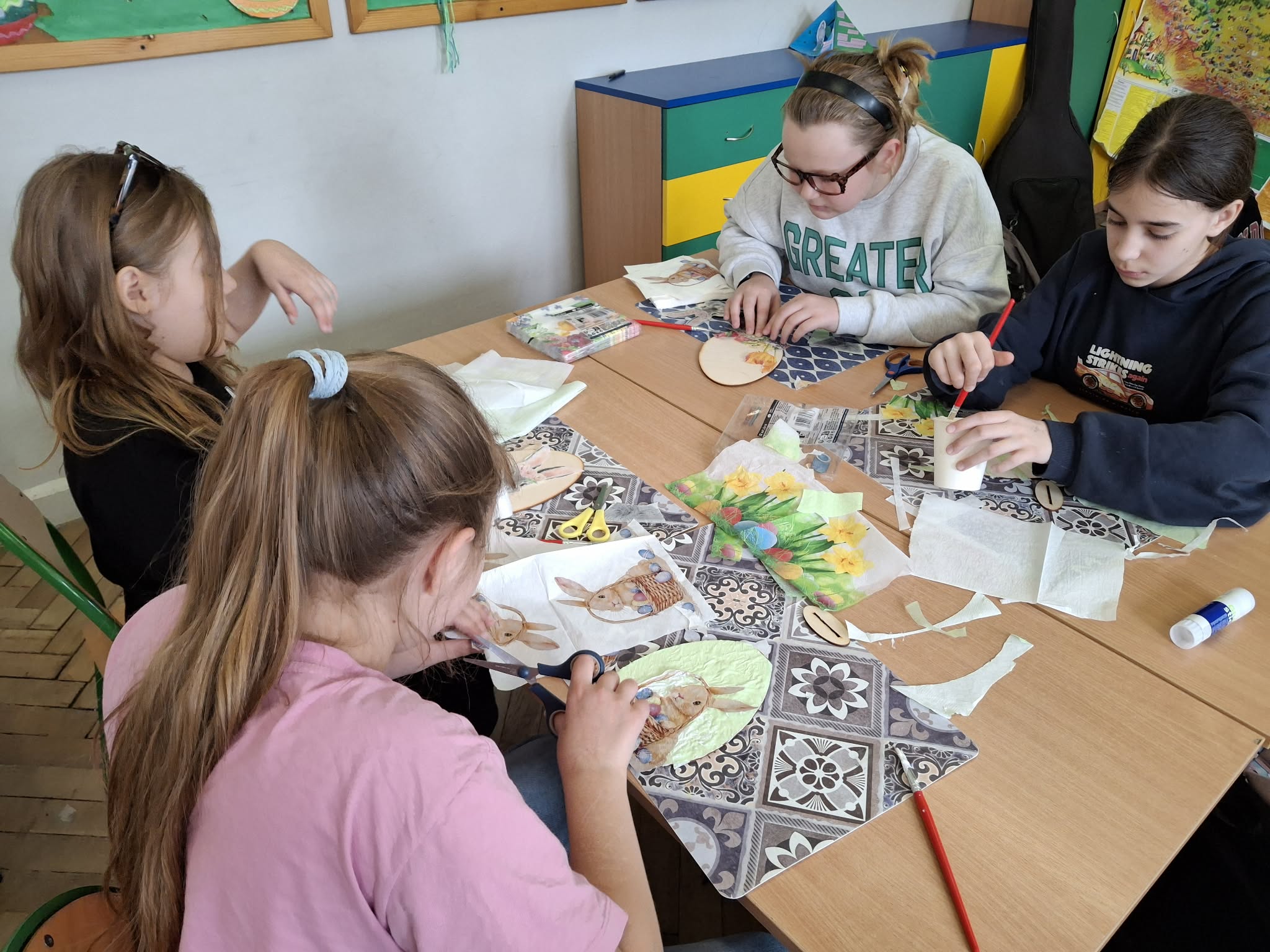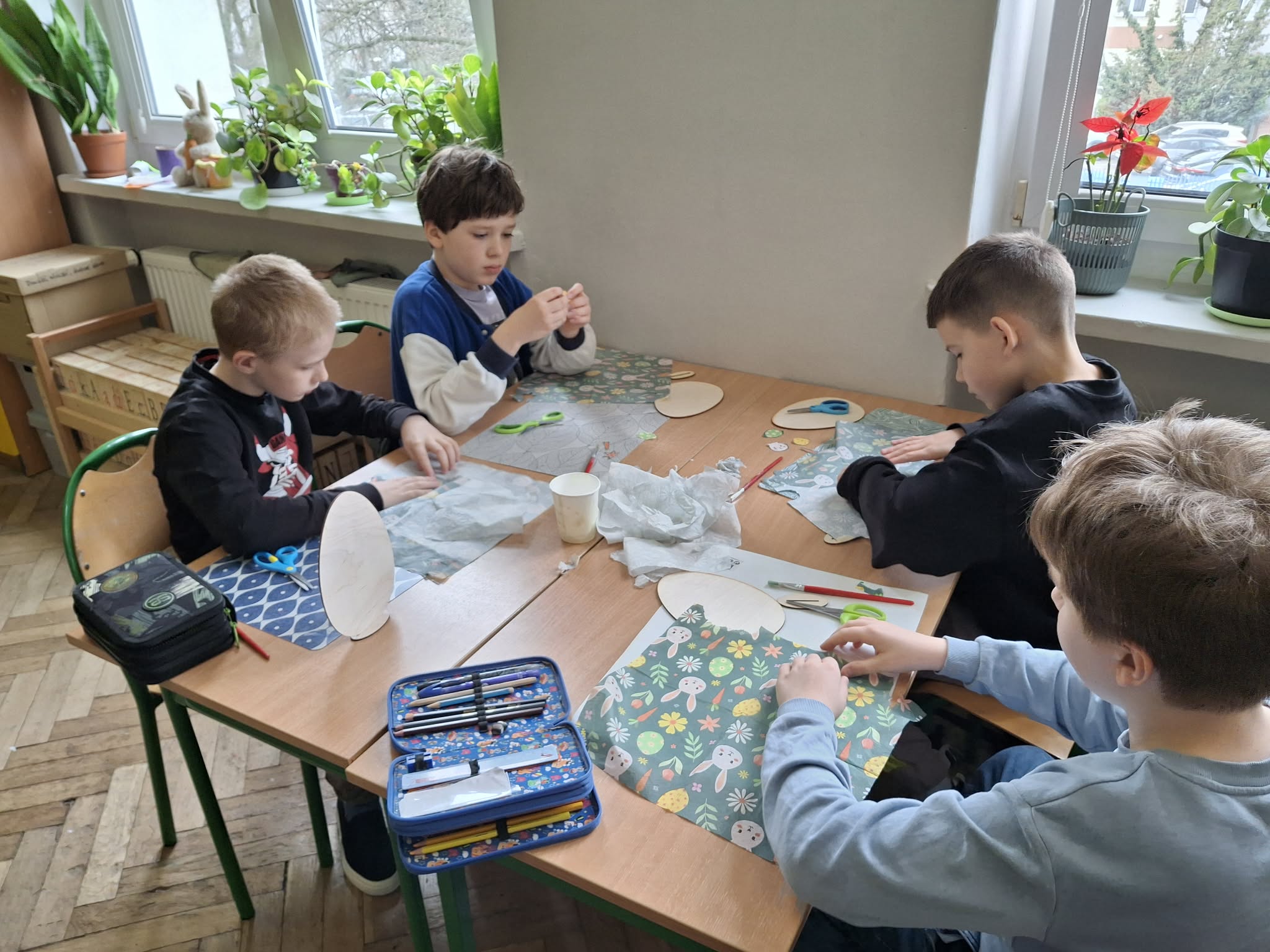 Podczas zajęć uczniowie mieli możliwość własnoręcznie ozdabiać drewniane jajka. Praca polegała na starannym wyklejaniu ich kolorowymi serwetkami. Dzięki temu powstały piękne, niepowtarzalne ozdoby o świątecznym charakterze. Warsztaty przebiegały w miłej i twórczej atmosferze. Uczniowie z dużym zaangażowaniem podchodzili do swoich prac, wykazując się pomysłowością i dbałością o detale. Każde jajko było inne i wyjątkowe, co najlepiej świadczy o bogatej wyobraźni naszych młodych artystów.