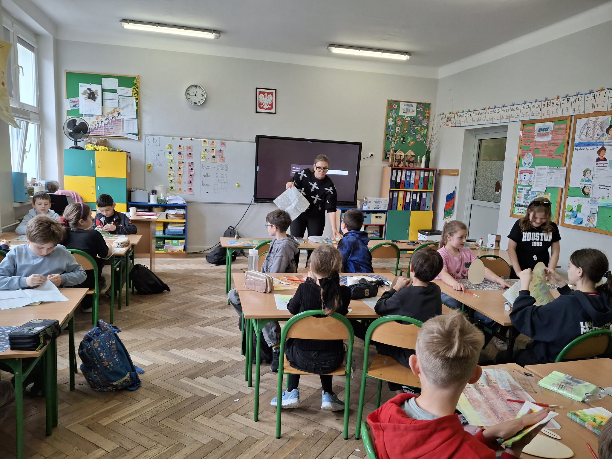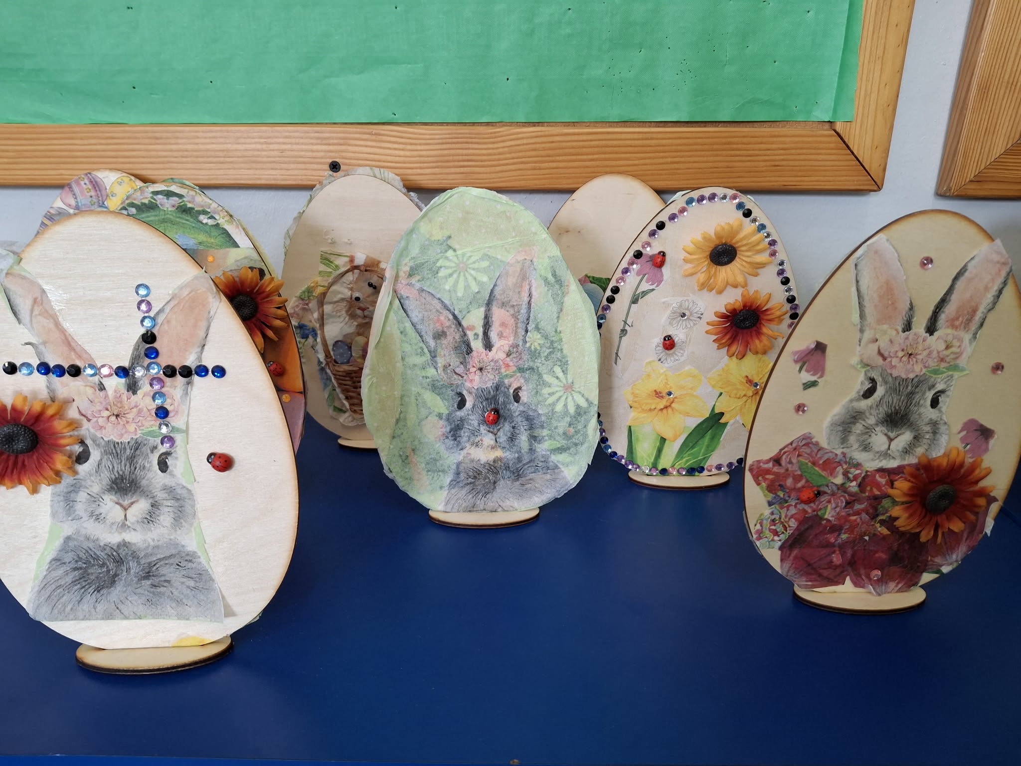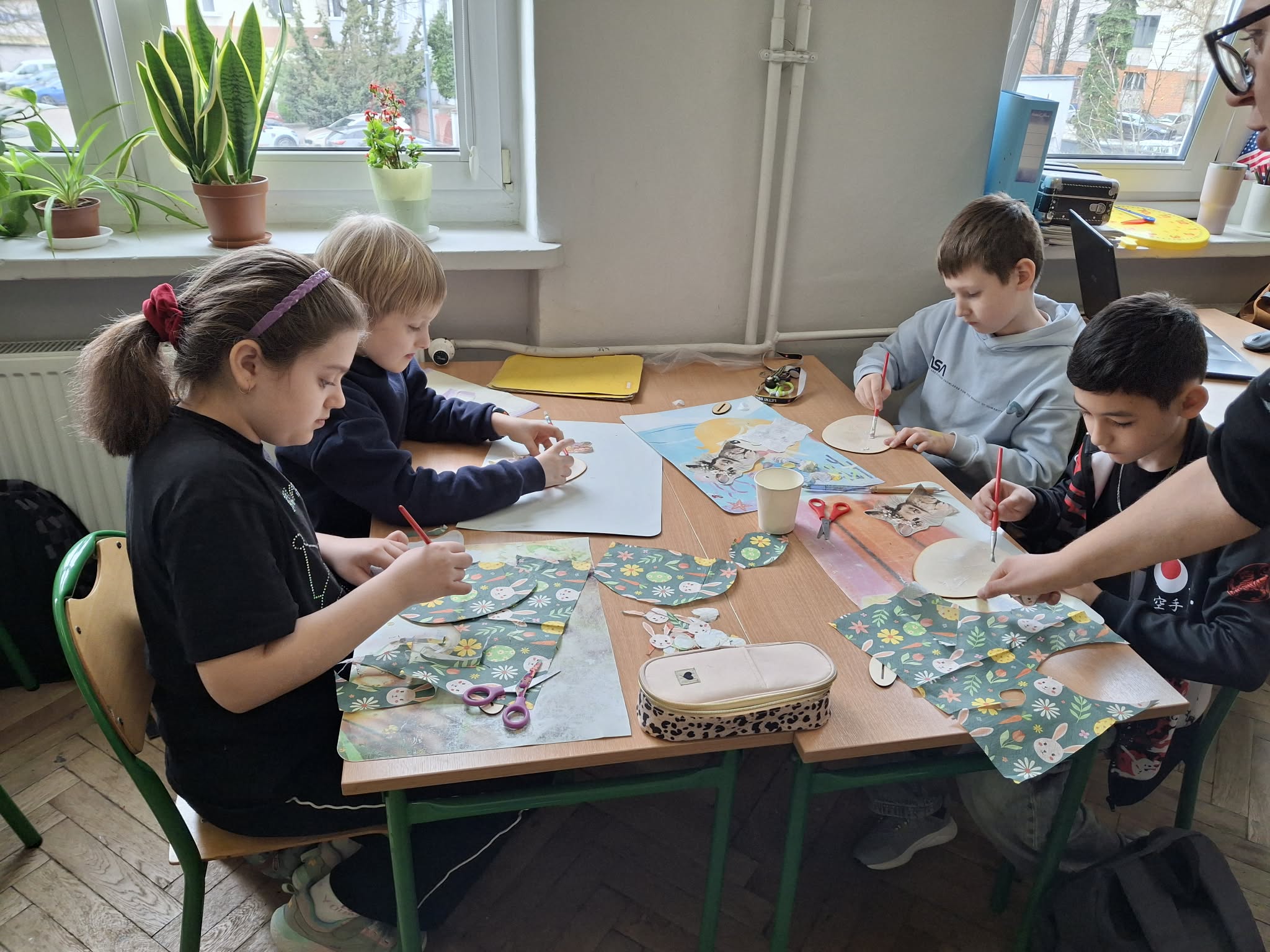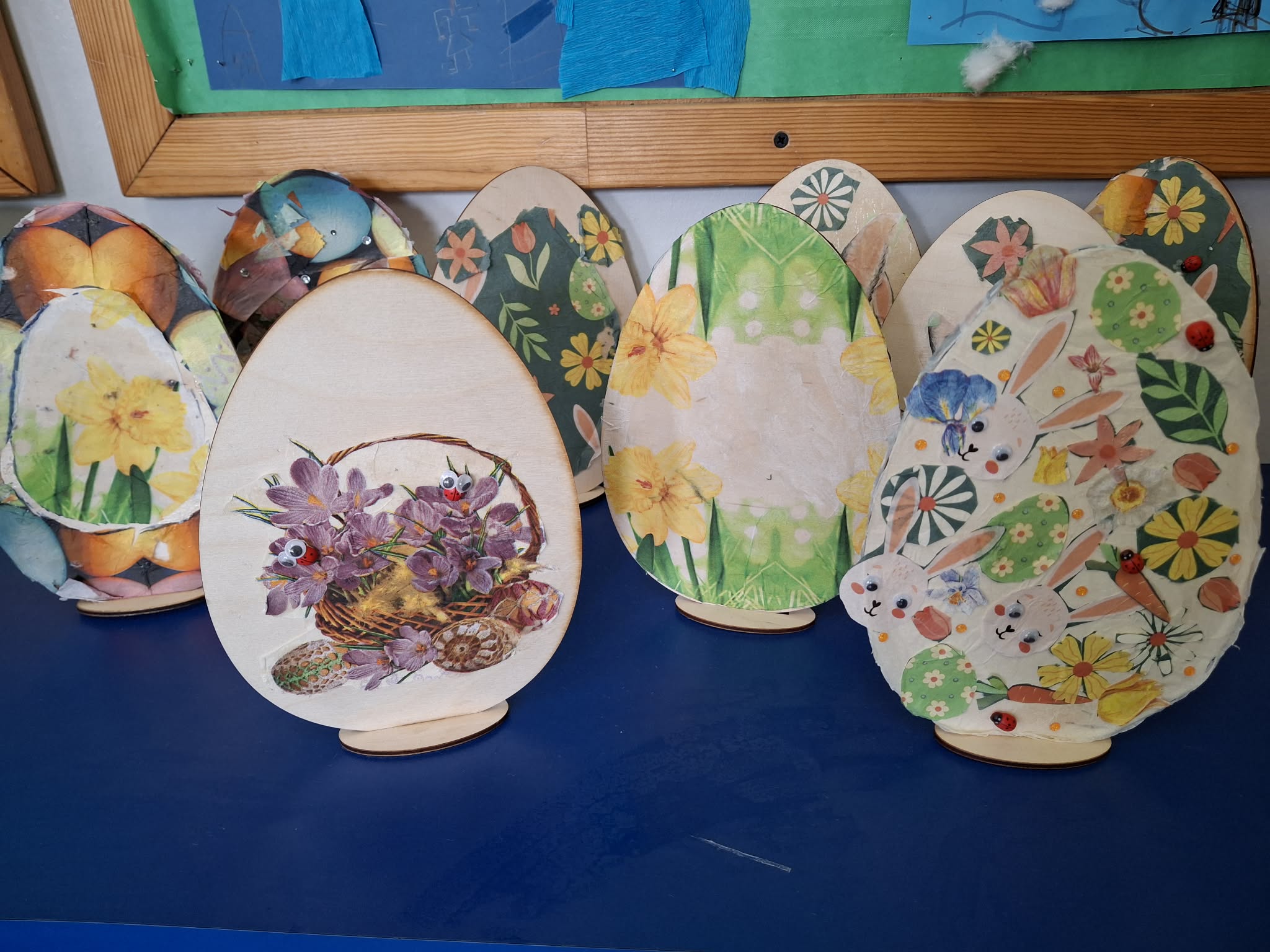 Podczas zajęć uczniowie mieli możliwość własnoręcznie ozdabiać drewniane jajka. Praca polegała na starannym wyklejaniu ich kolorowymi serwetkami. Dzięki temu powstały piękne, niepowtarzalne ozdoby o świątecznym charakterze. Warsztaty przebiegały w miłej i twórczej atmosferze. Uczniowie z dużym zaangażowaniem podchodzili do swoich prac, wykazując się pomysłowością i dbałością o detale. Każde jajko było inne i wyjątkowe, co najlepiej świadczy o bogatej wyobraźni naszych młodych artystów.