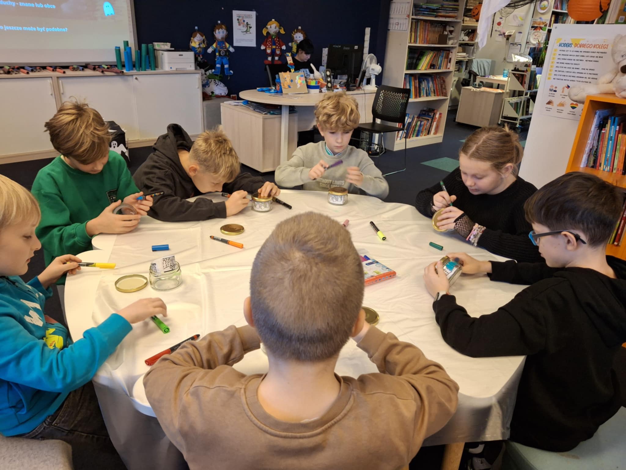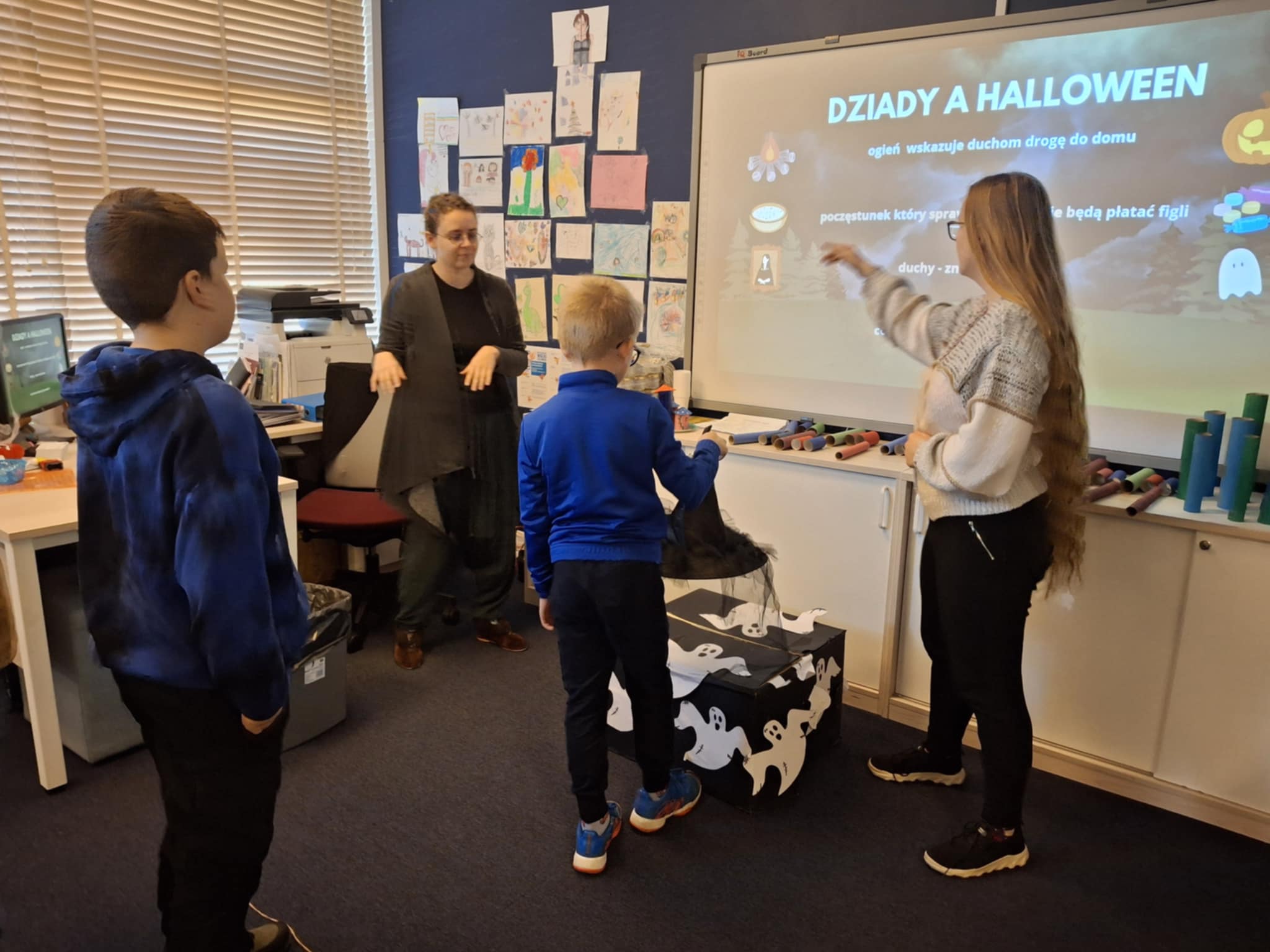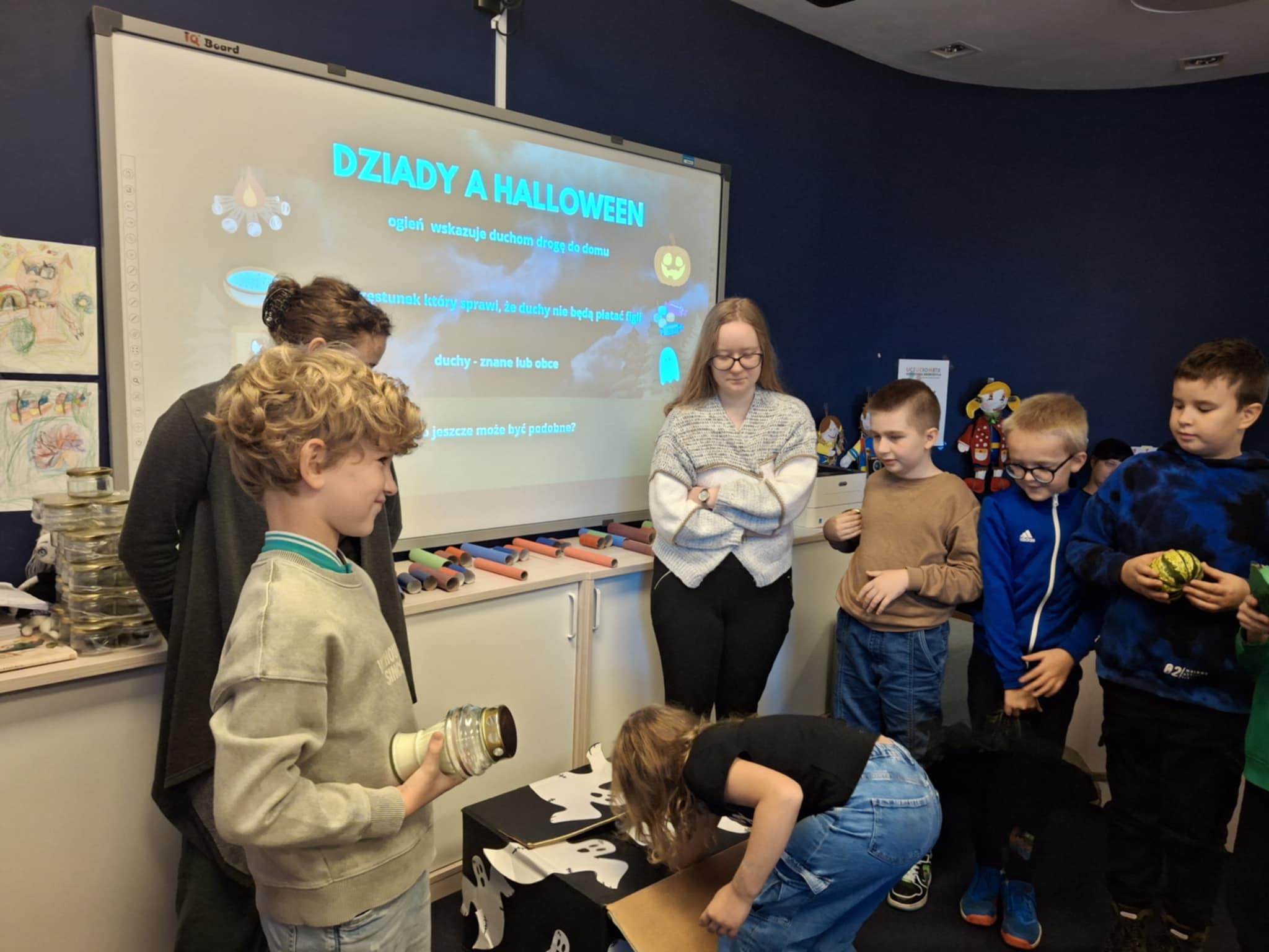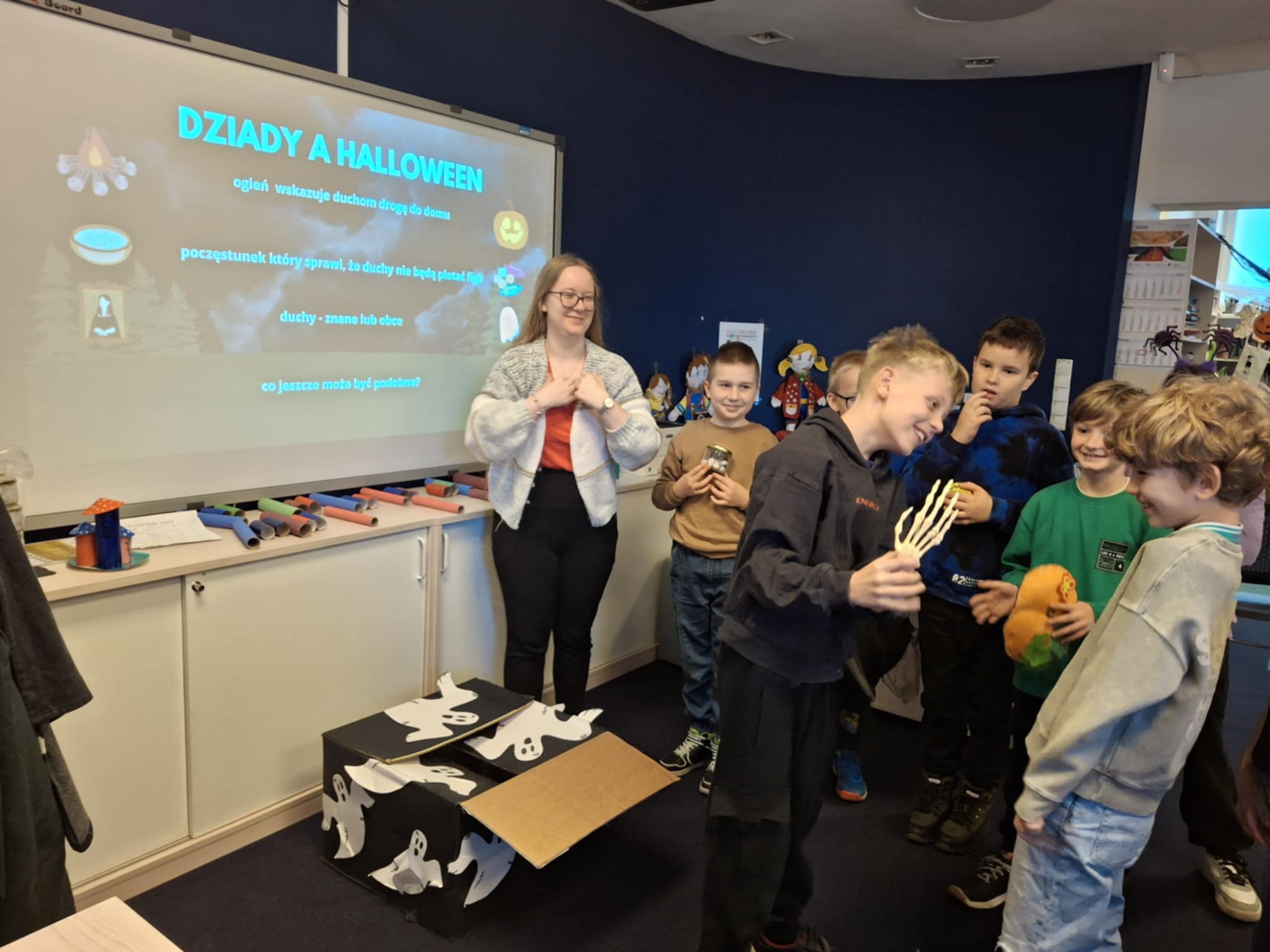 Zapoznaliśmy się ze staropolskim obrzędem dziadów. Dowiedzieliśmy się jak wyglądały kraboszki, a także jak można było udobruchać dusze zmarłych. Wskazaliśmy różnice i podobieństwa pomiędzy zabawami związanymi z Halloween, a zwyczajami naszych przodków. Na zakończenie przygotowaliśmy piękne lampiony. To było ciekawe spotkanie współczesności z dawnymi obyczajami.