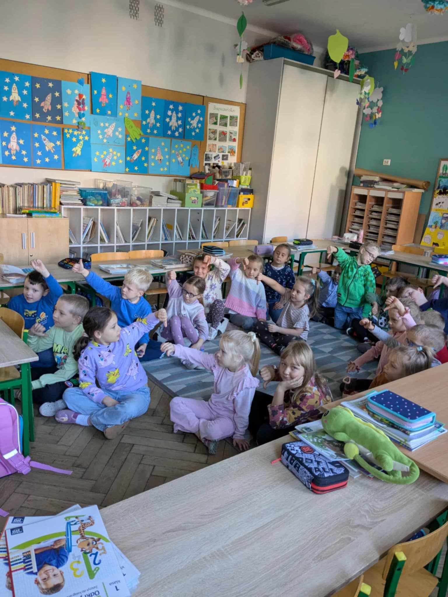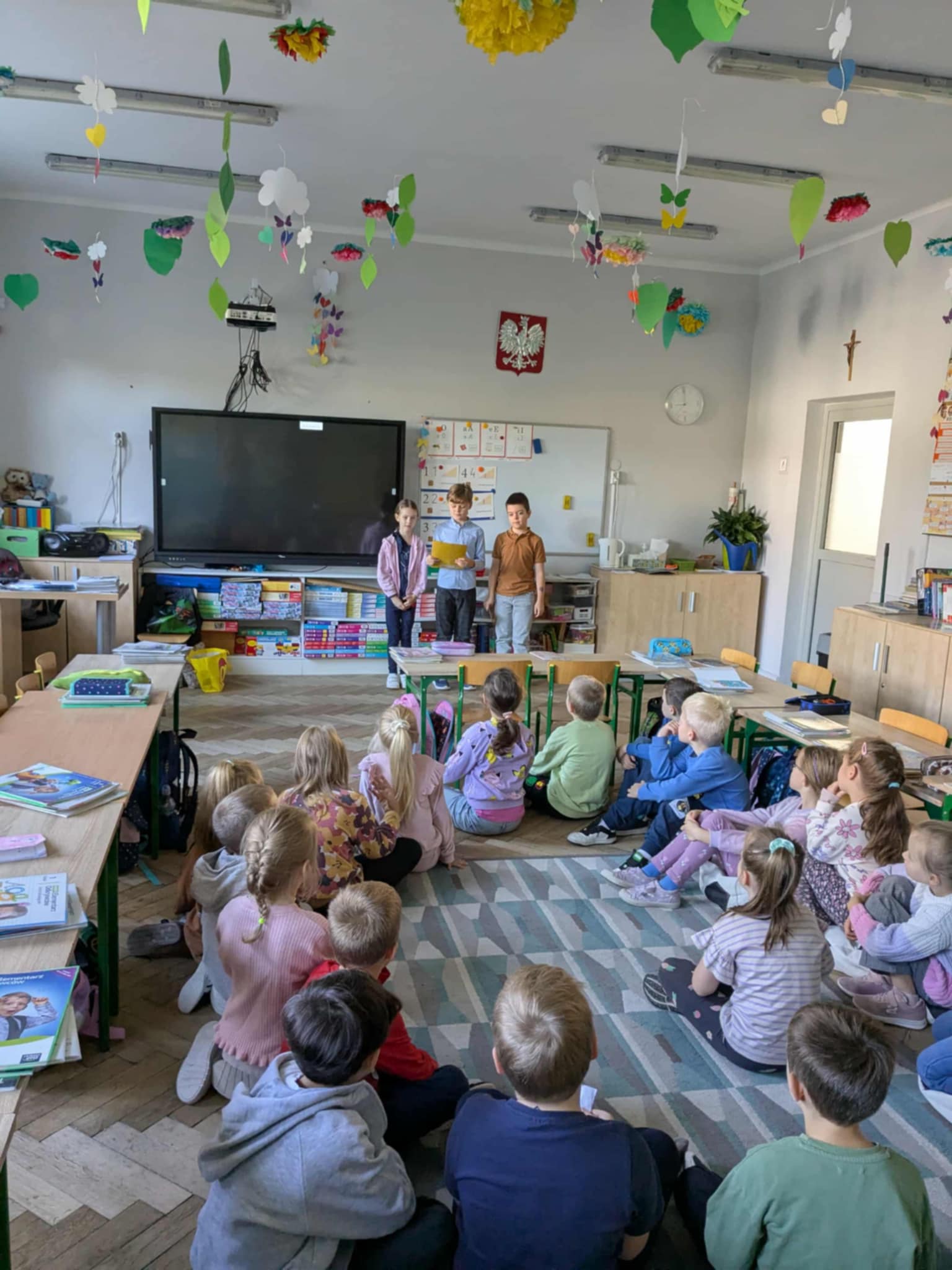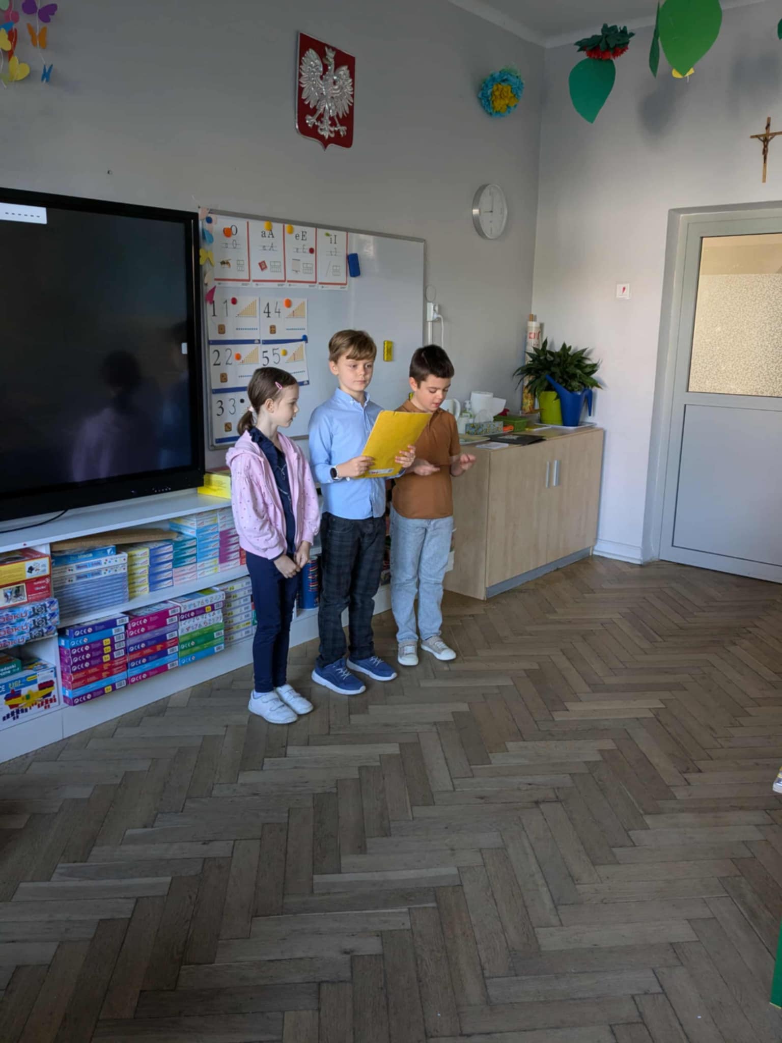 że przemoc jest złym zachowaniem, opowiedzieli jakie zachowania są uznane za przemoc, zadawali zagadki, zrobii mały quiz wiedzy, na który młodsi koledzy odpowaidali uniesieniem kciuka w dół lub w górę, poinformowali kolegów, gdzie szukać pomocy, gdy przemocy się doświadcza lub jej się jej świadkiem. Brawo dla uczniów klasy 2b za odwagę i inicjatywę.