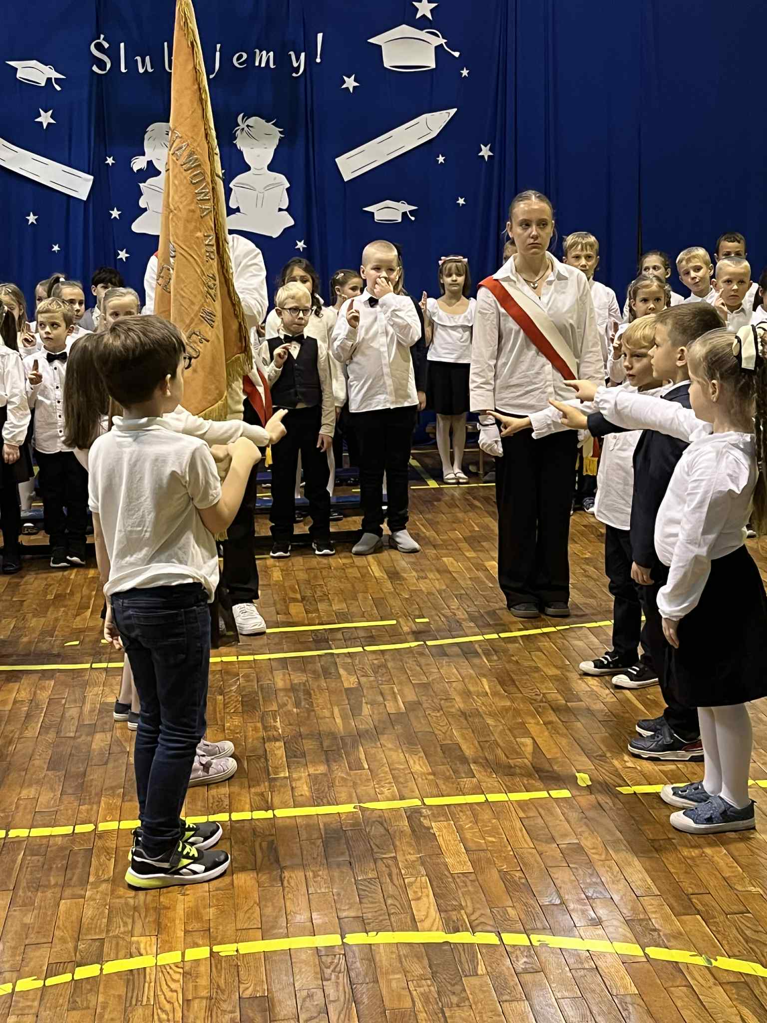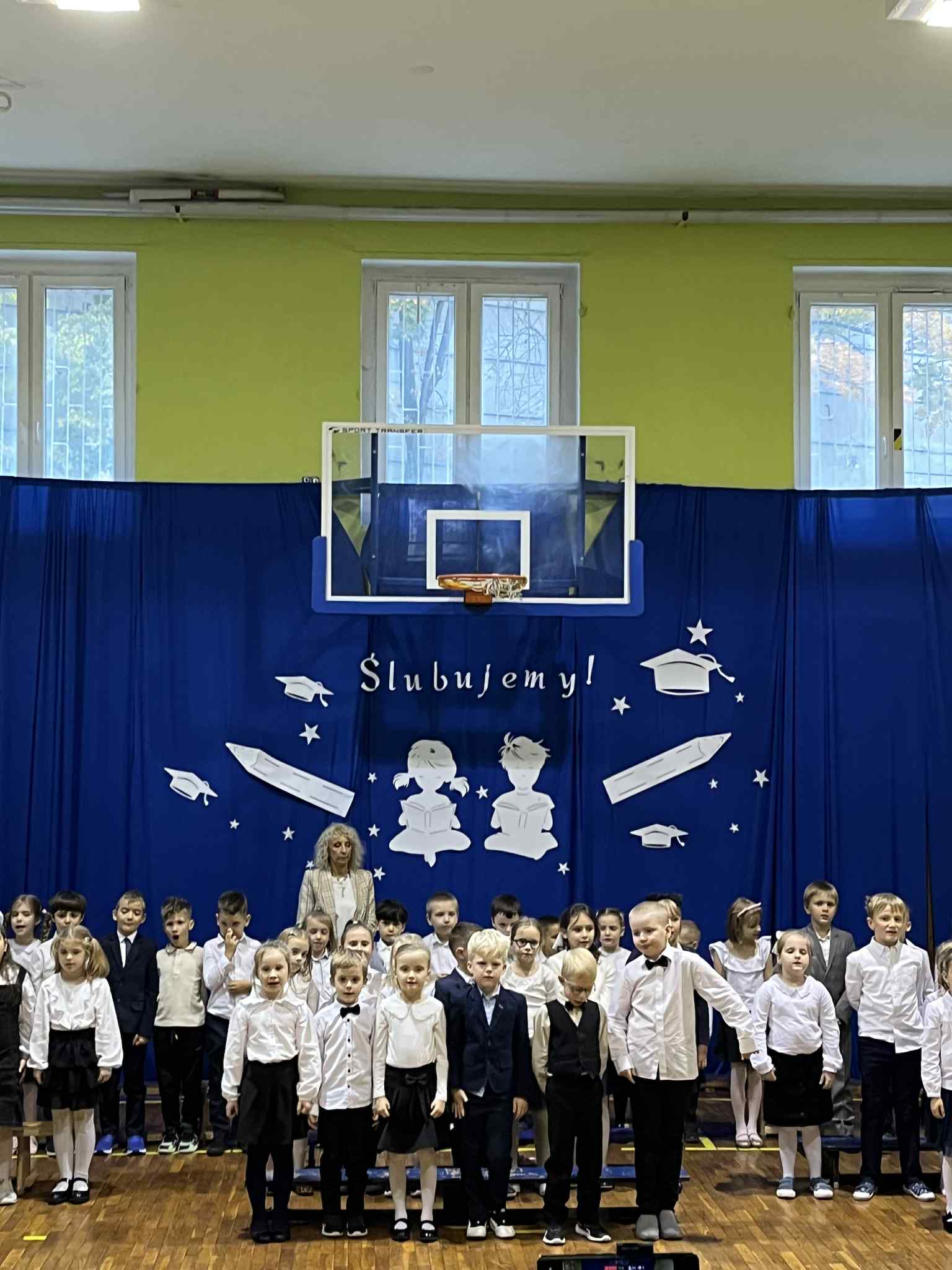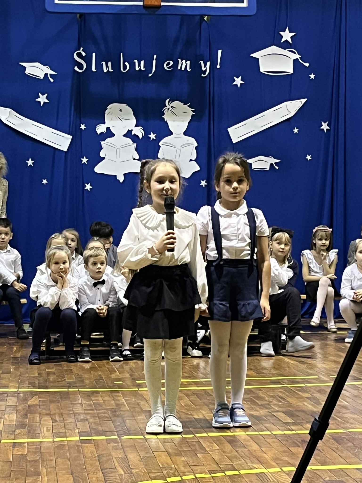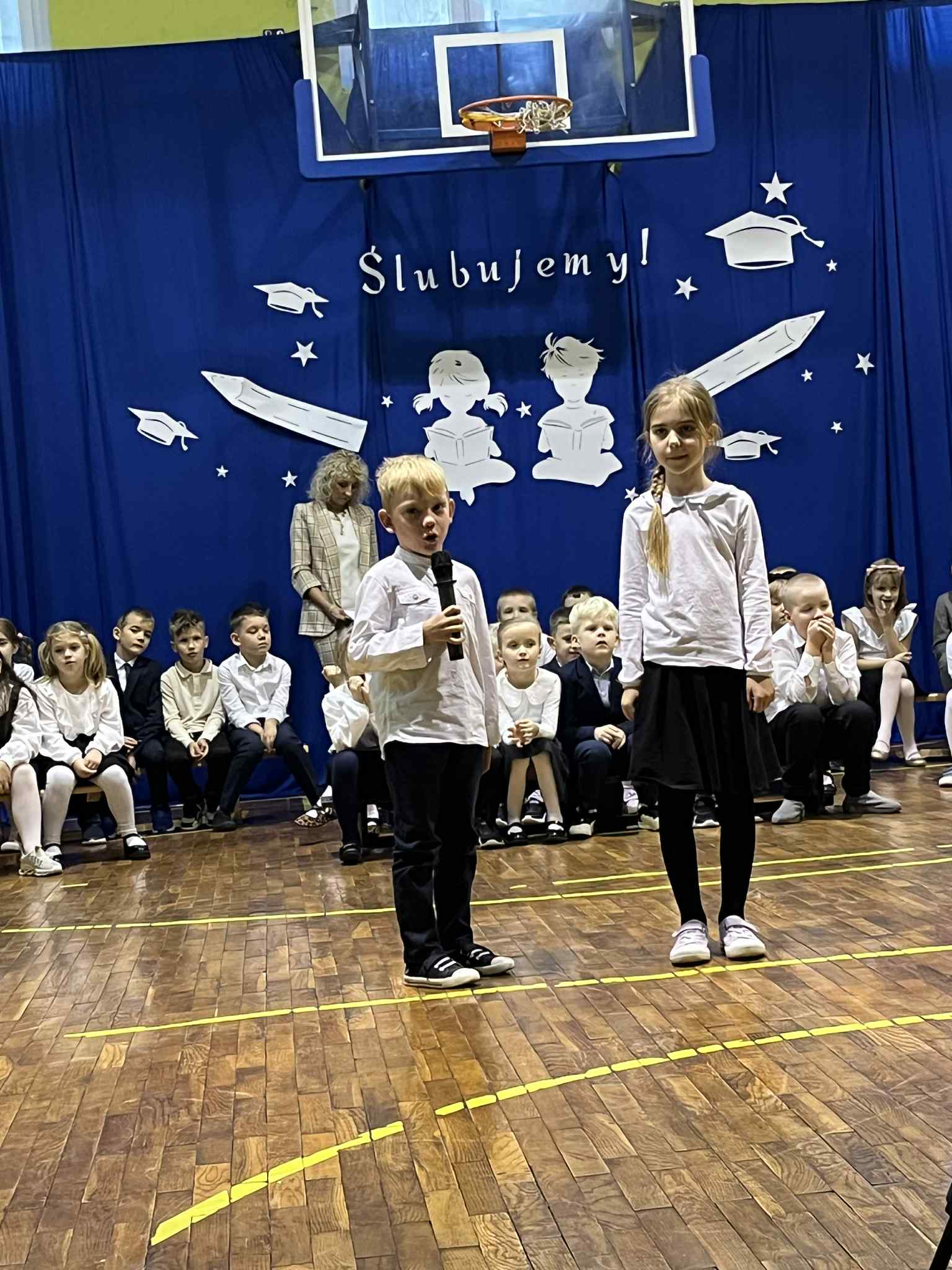 Po części artystycznej nastąpił najważniejszy moment – uroczyste ślubowanie. Pani Dyrektor wraz z Panią Wicedyrektor przyjęli przysięgę od pierwszoklasistów, którzy obiecali pilnie się uczyć, być dobrymi kolegami i dbać o honor szkoły. Następnie każdy uczeń został symbolicznie pasowany na ucznia, co wzbudziło wiele emocji i dumy.