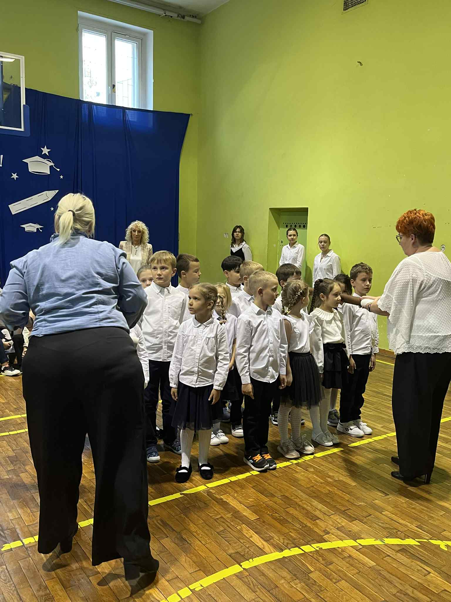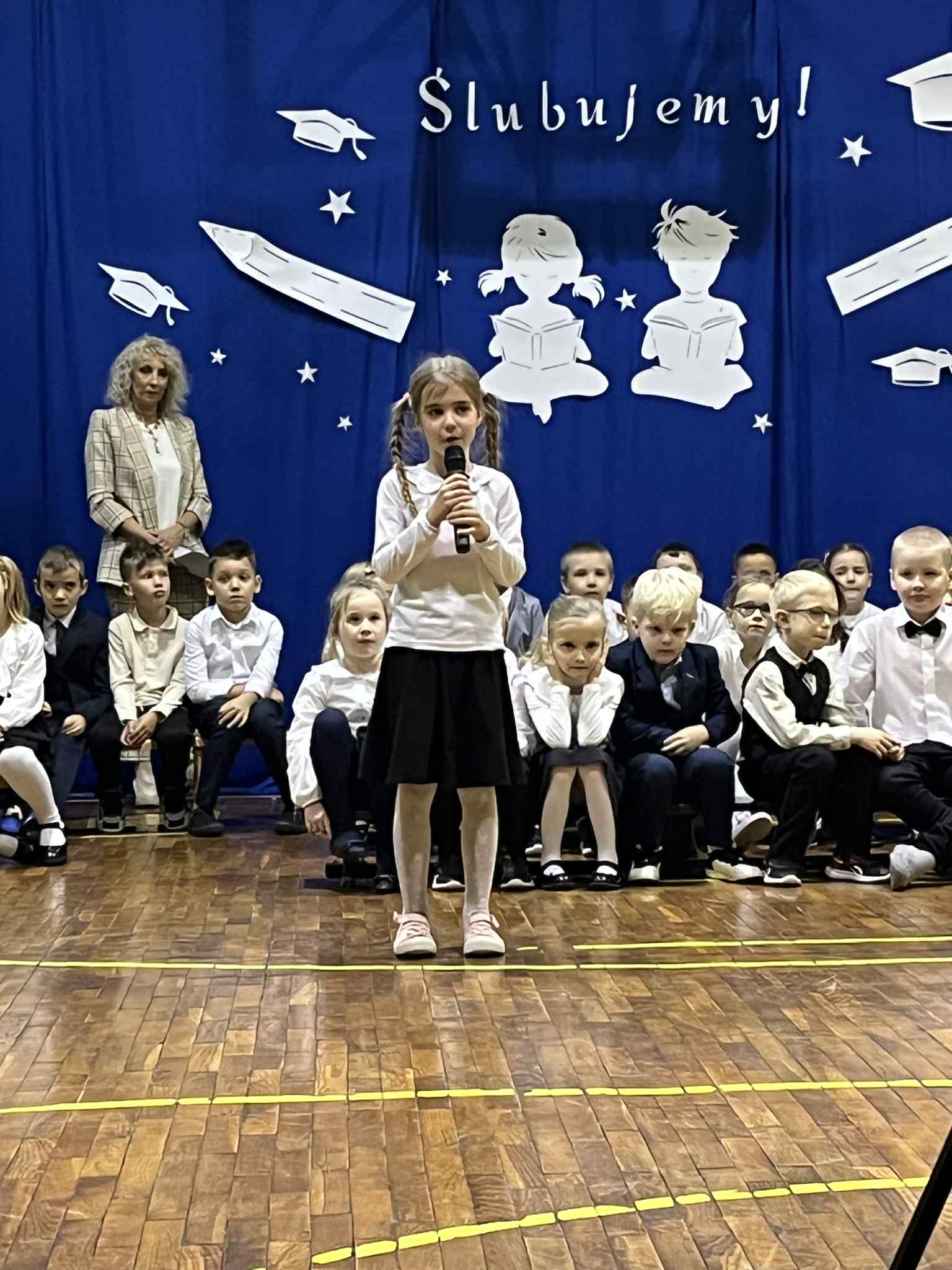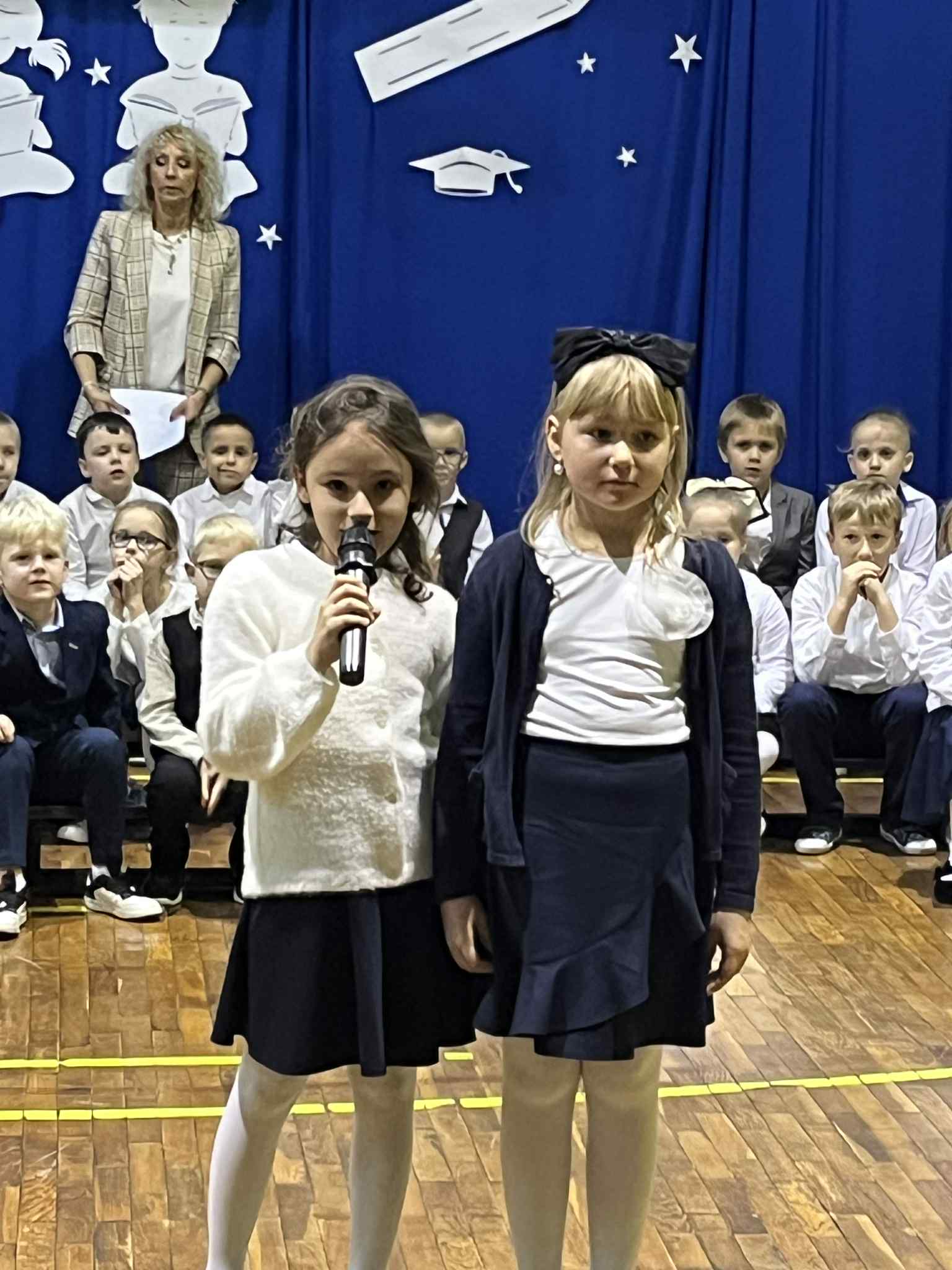 Po części artystycznej nastąpił najważniejszy moment – uroczyste ślubowanie. Pani Dyrektor wraz z Panią Wicedyrektor przyjęli przysięgę od pierwszoklasistów, którzy obiecali pilnie się uczyć, być dobrymi kolegami i dbać o honor szkoły. Następnie każdy uczeń został symbolicznie pasowany na ucznia, co wzbudziło wiele emocji i dumy.
