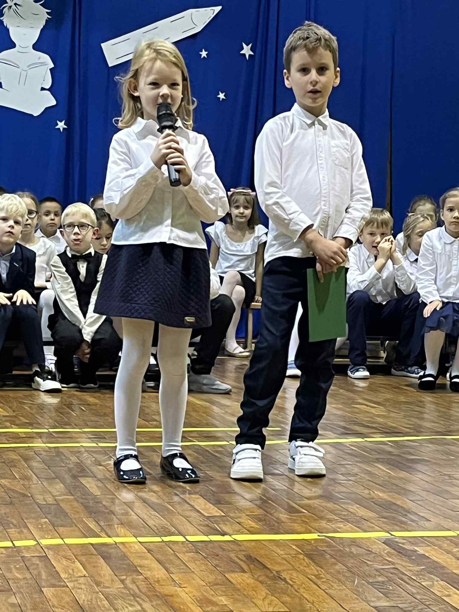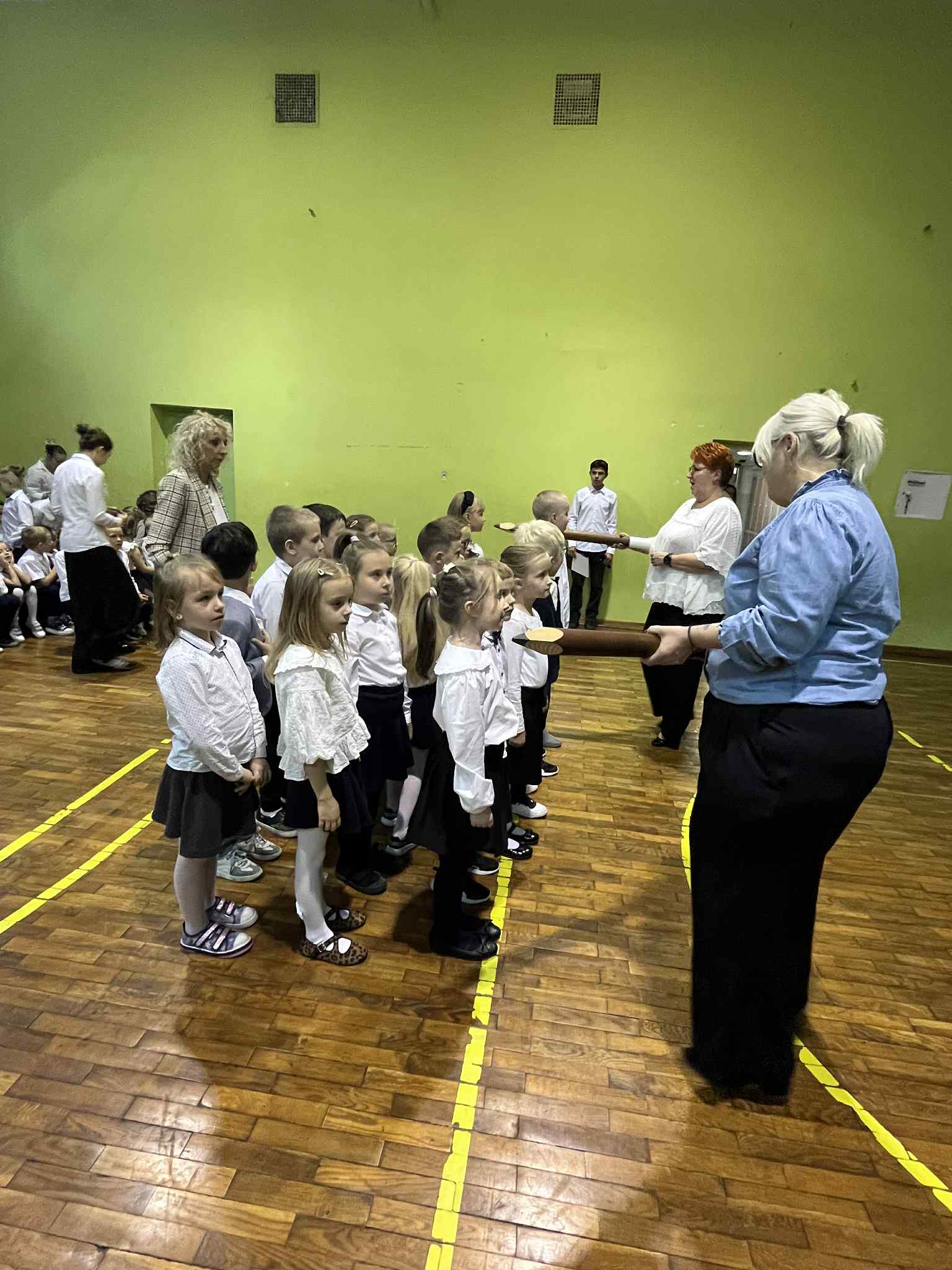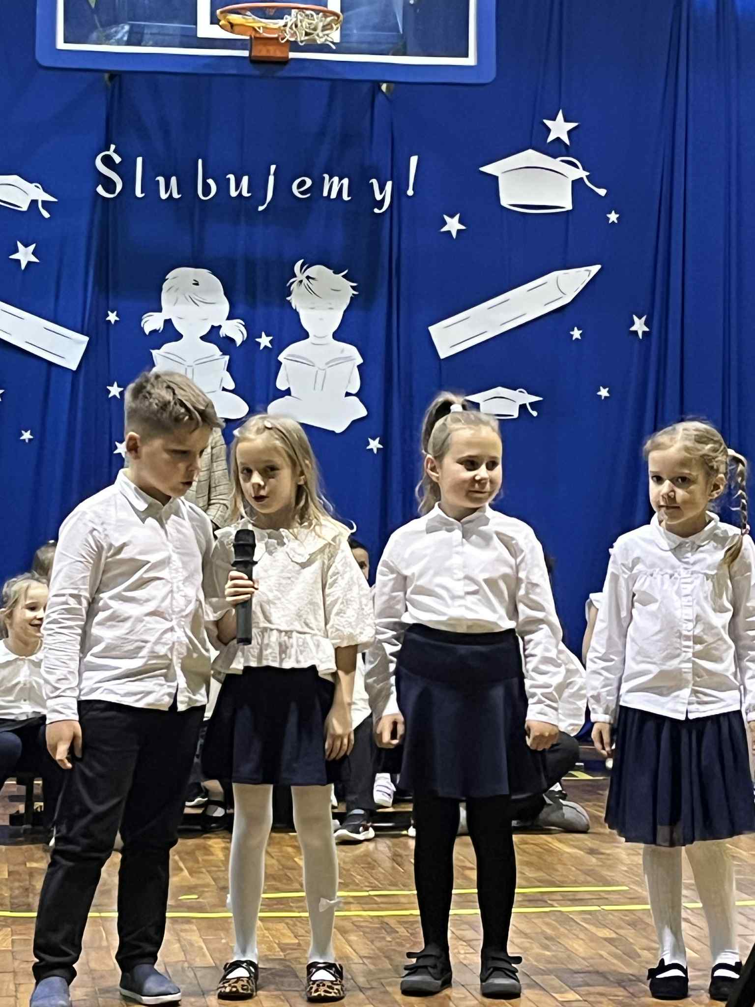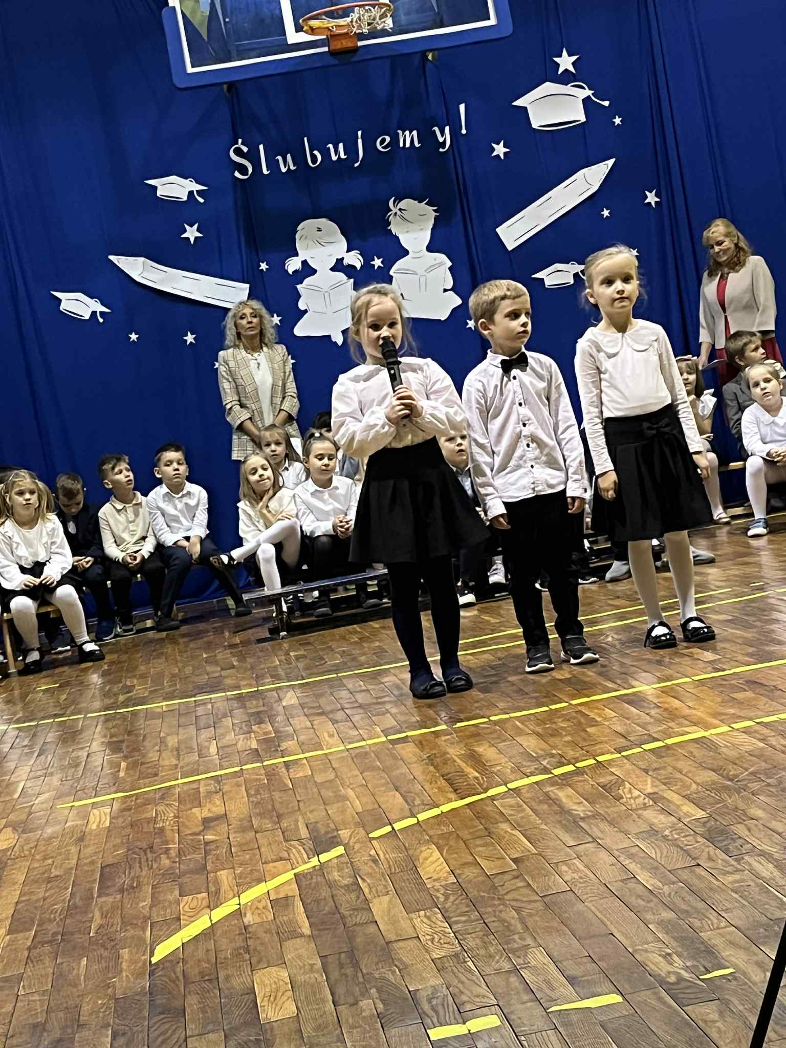 Po części artystycznej nastąpił najważniejszy moment – uroczyste ślubowanie. Pani Dyrektor wraz z Panią Wicedyrektor przyjęli przysięgę od pierwszoklasistów, którzy obiecali pilnie się uczyć, być dobrymi kolegami i dbać o honor szkoły. Następnie każdy uczeń został symbolicznie pasowany na ucznia, co wzbudziło wiele emocji i dumy.