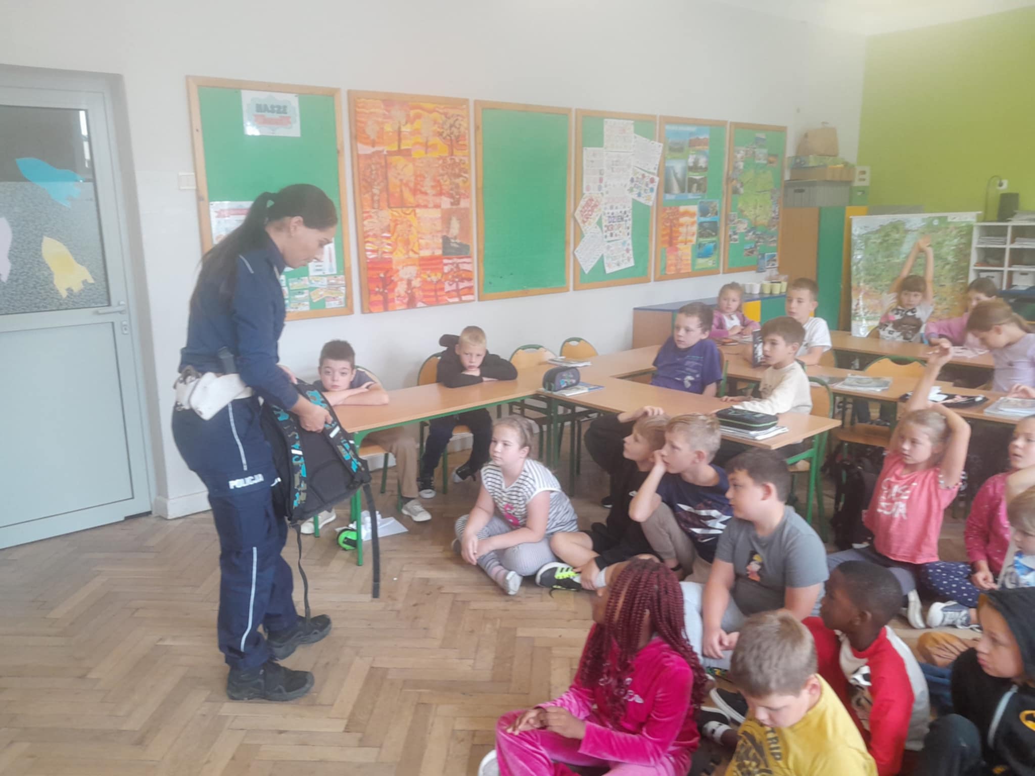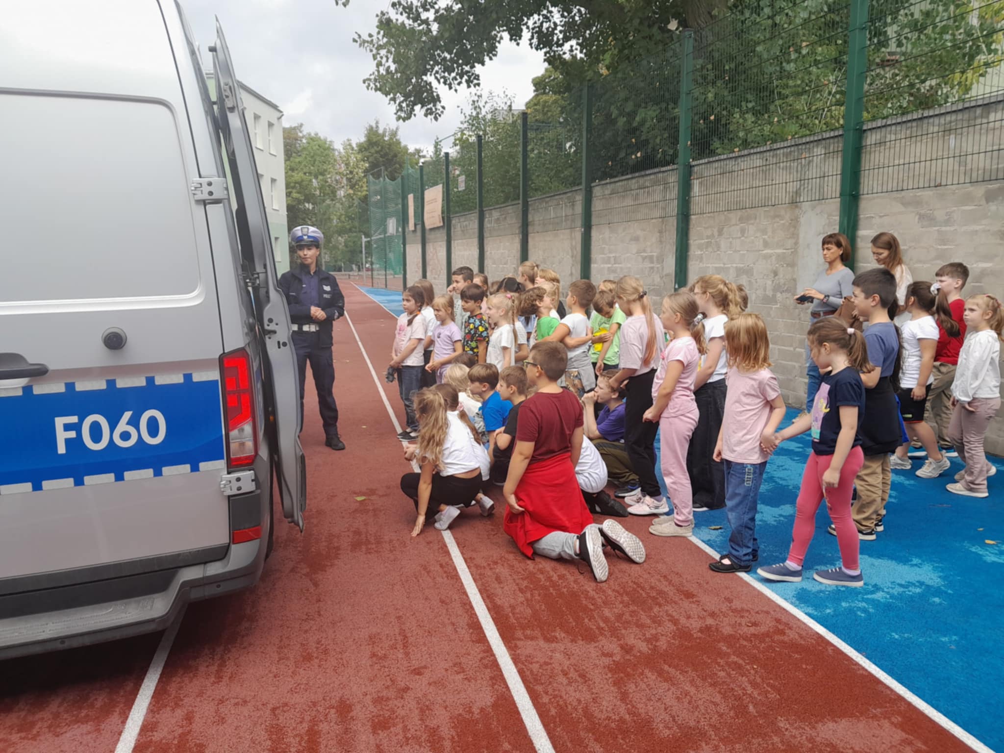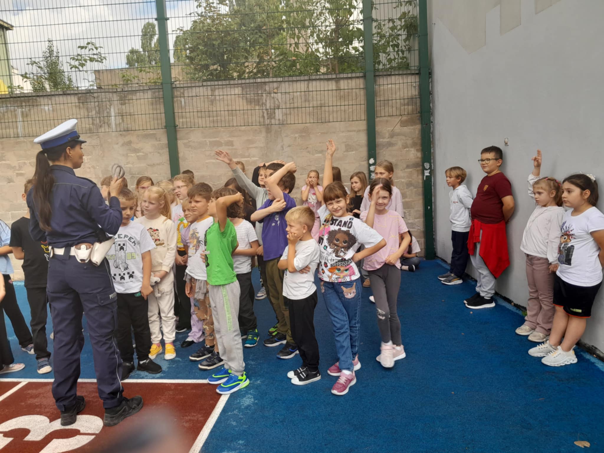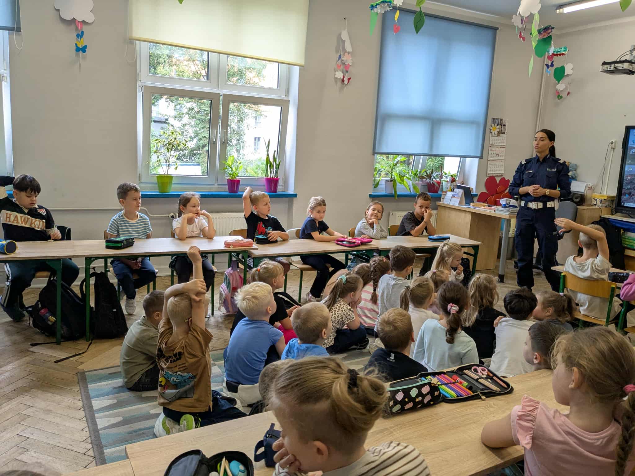 Powtórzyli wiadomości na temat zasad przechodzenia przez jezdnię – obligatoryjnie na przejściu dla pieszych, na zielonym świetle i zachowaniu zasady ograniczonego zaufania do kierujących pojazdami. Podkreślono znaczenie noszenia elementów odblaskowych na odzieży i plecaku szkolnym oraz uzasadniono konieczność rozglądania się przed wejściem na pasy w lewo, prawo, lewo. Uczniowie pogłębili także wiedzę na temat bezpieczeństwa podczas jazdy samochodem – koniecznie w pasach - na rowerze czy hulajnodze. Pani policjantka podkreślała znaczenie posiadania kasku na głowie, obowiązkowego przeprowadzania roweru/hulajnogi przez pasy oraz konieczność obowiązkowego wyposażenia roweru. Są to: dzwonek, co najmniej jeden działający hamulec, elementy odblaskowe, światło białe z przodu i czerwone z tyłu. Ciekawostką była informacja, że dźwięk dzwonka przy rowerze nie może być drażniący, by nie przestraszyć np. psa, który ze strachu może zaatakować. Dzieci dowiedziały się także, że kartę rowerową mogą wyrobić dopiero mając 10 lat i by ją osiągnąć muszą zdać egzamin pisemny i ustny. Całe spotkanie było bardzo ciekawe, uczniowie mieli możliwość zadawania pytań oraz dzielenia się własnymi doświadczeniami. Dopełnieniem atrakcyjnego spotkania była unikalna możliwość oględzin radiowozu.
