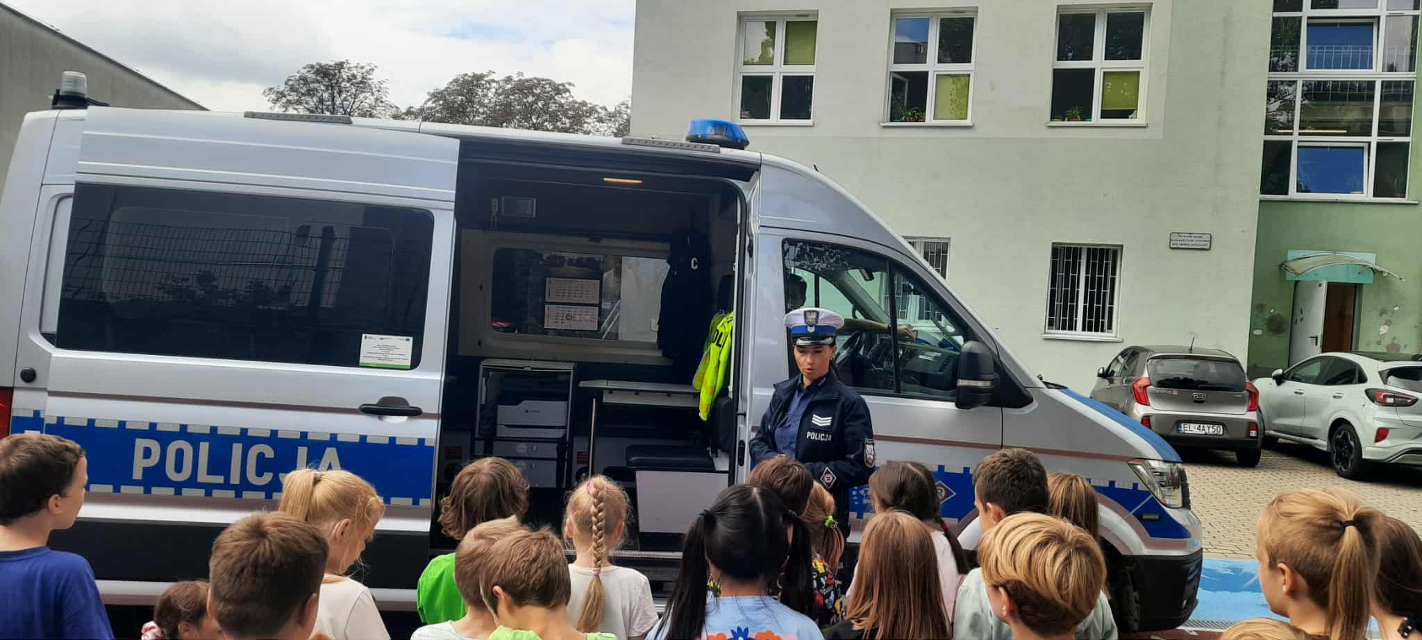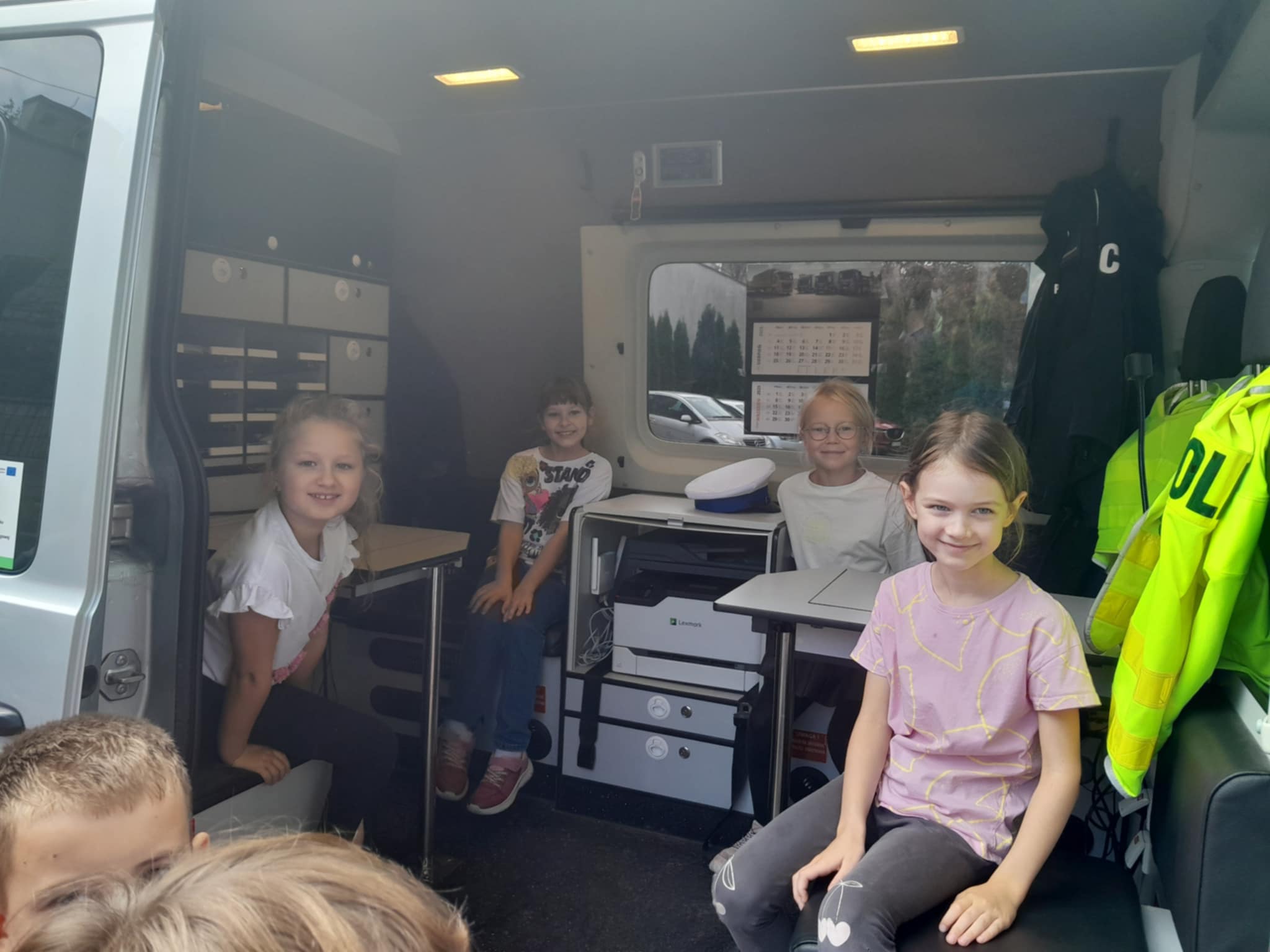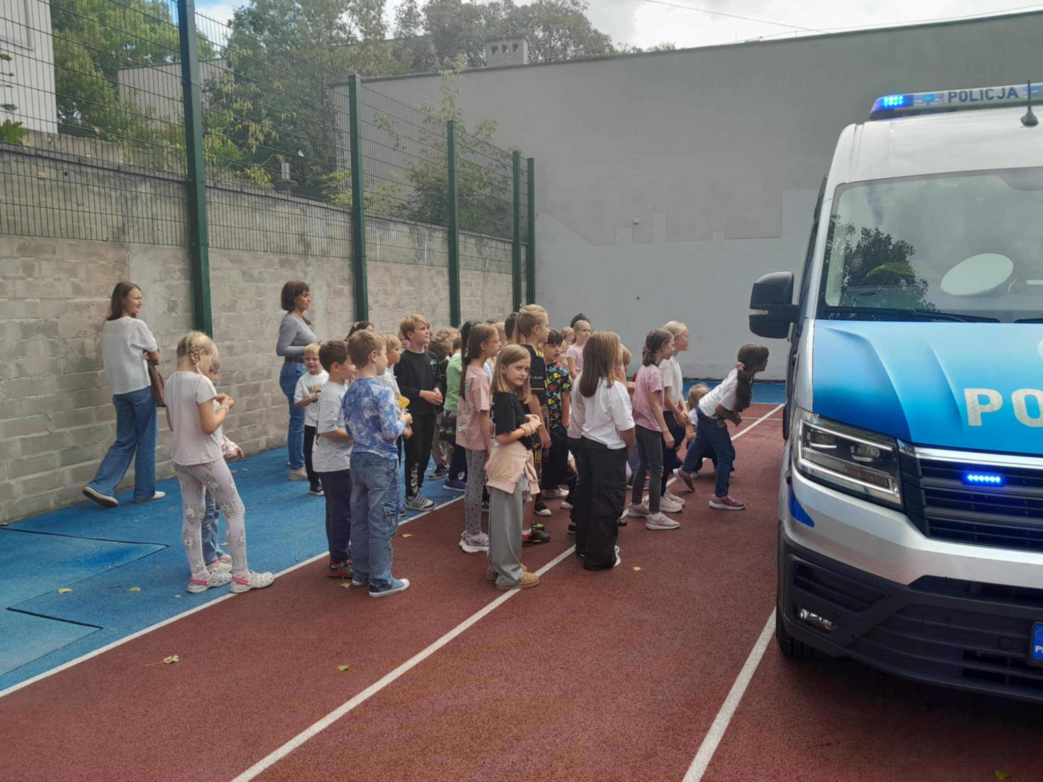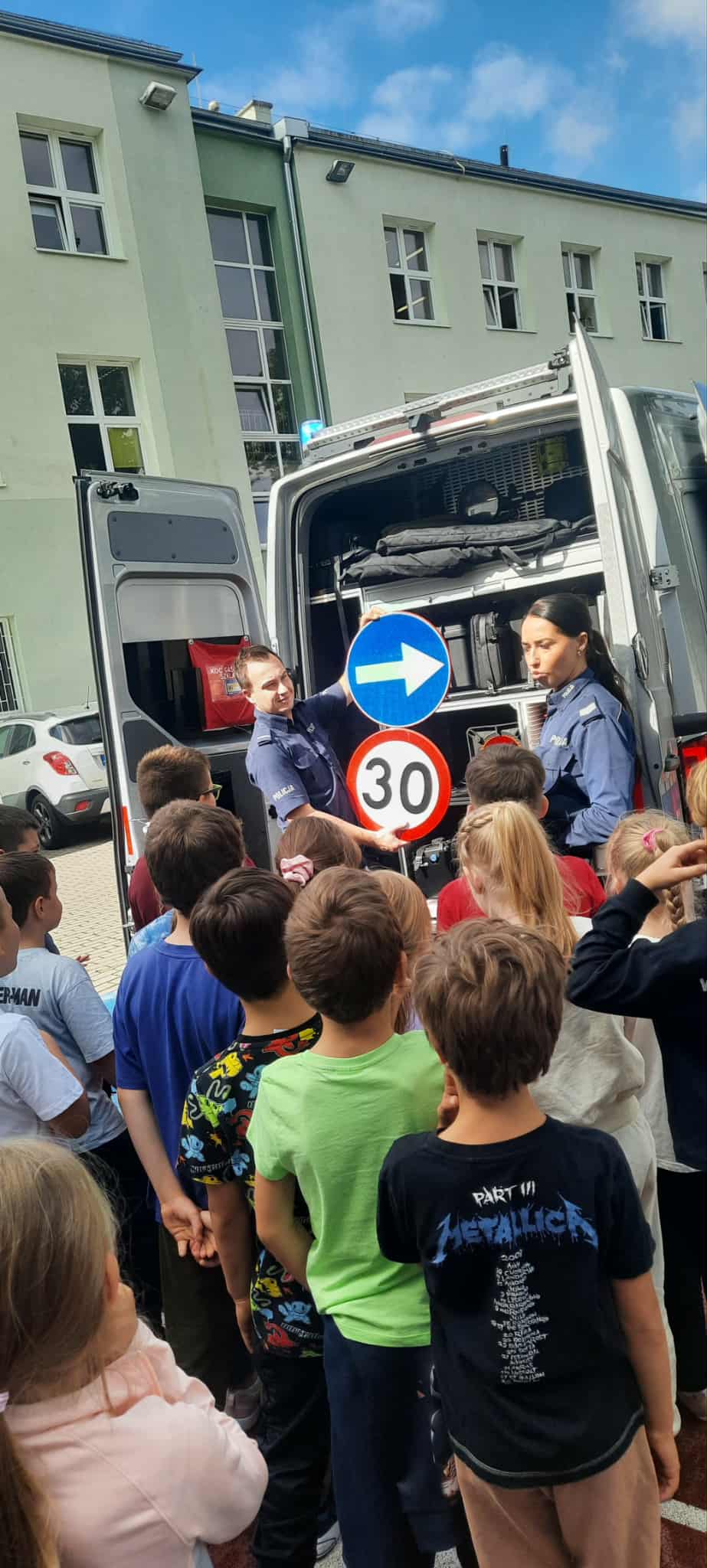 Powtórzyli wiadomości na temat zasad przechodzenia przez jezdnię – obligatoryjnie na przejściu dla pieszych, na zielonym świetle i zachowaniu zasady ograniczonego zaufania do kierujących pojazdami. Podkreślono znaczenie noszenia elementów odblaskowych na odzieży i plecaku szkolnym oraz uzasadniono konieczność rozglądania się przed wejściem na pasy w lewo, prawo, lewo. Uczniowie pogłębili także wiedzę na temat bezpieczeństwa podczas jazdy samochodem – koniecznie w pasach - na rowerze czy hulajnodze. Pani policjantka podkreślała znaczenie posiadania kasku na głowie, obowiązkowego przeprowadzania roweru/hulajnogi przez pasy oraz konieczność obowiązkowego wyposażenia roweru. Są to: dzwonek, co najmniej jeden działający hamulec, elementy odblaskowe, światło białe z przodu i czerwone z tyłu. Ciekawostką była informacja, że dźwięk dzwonka przy rowerze nie może być drażniący, by nie przestraszyć np. psa, który ze strachu może zaatakować. Dzieci dowiedziały się także, że kartę rowerową mogą wyrobić dopiero mając 10 lat i by ją osiągnąć muszą zdać egzamin pisemny i ustny. Całe spotkanie było bardzo ciekawe, uczniowie mieli możliwość zadawania pytań oraz dzielenia się własnymi doświadczeniami. Dopełnieniem atrakcyjnego spotkania była unikalna możliwość oględzin radiowozu.