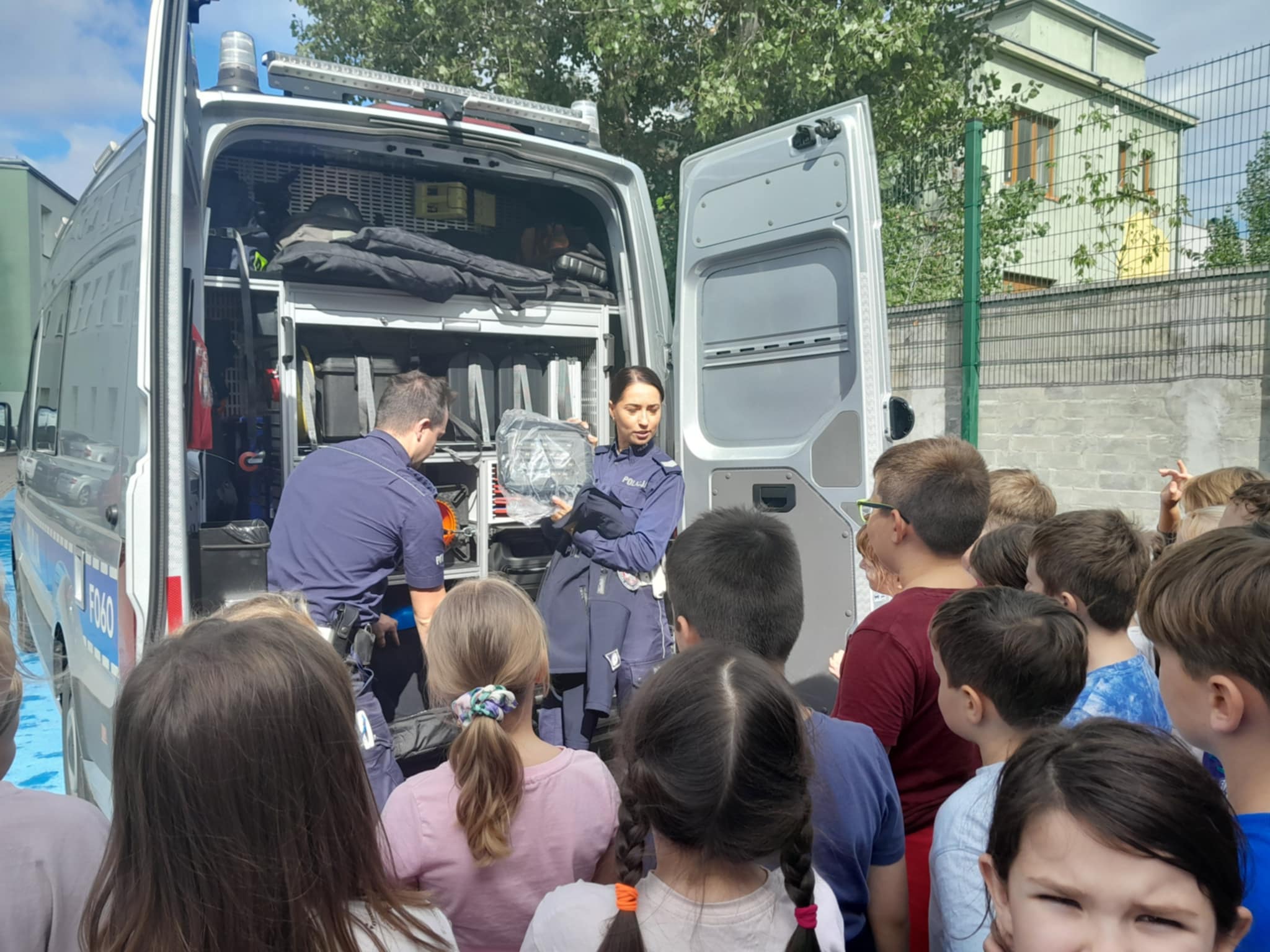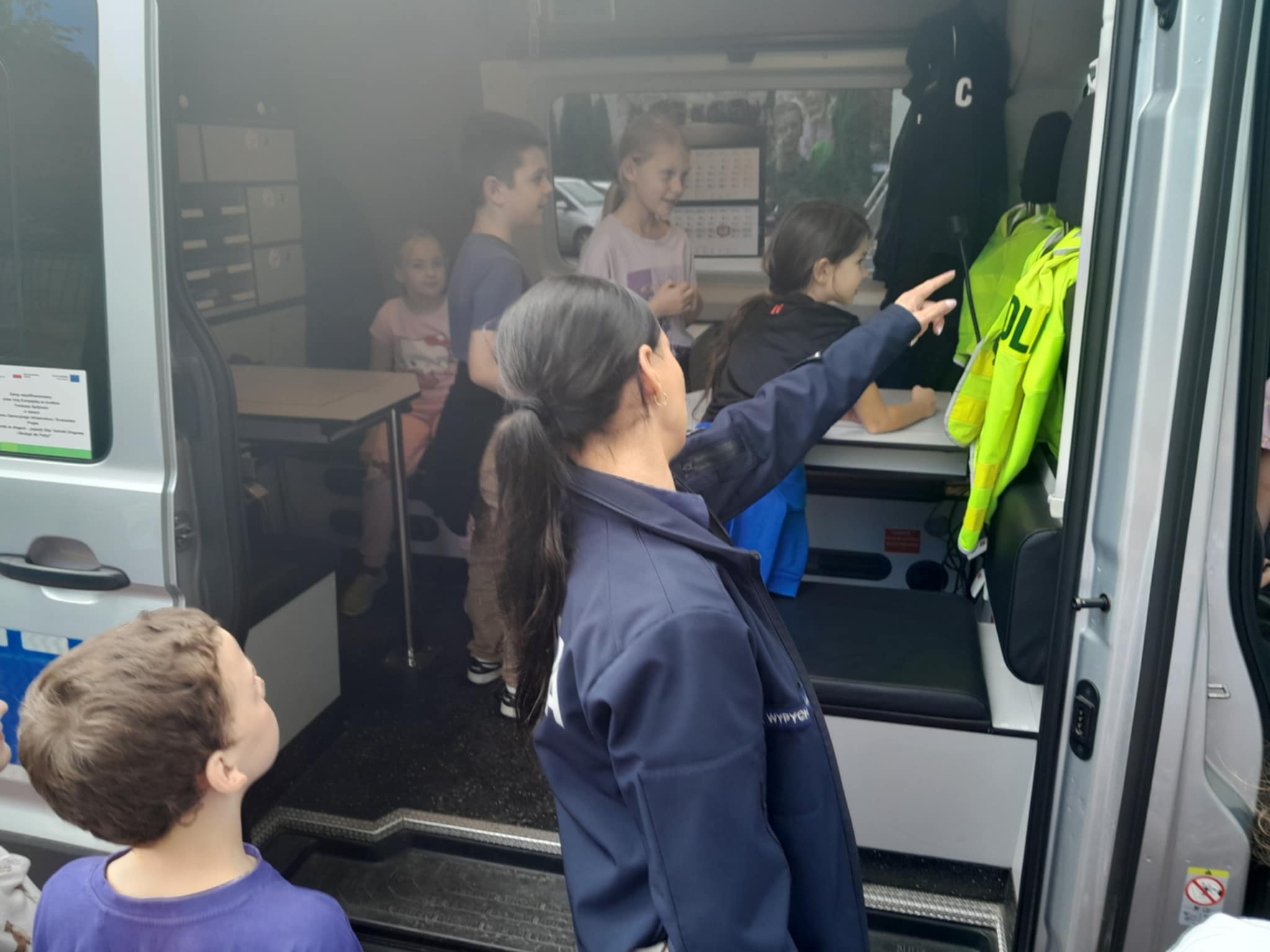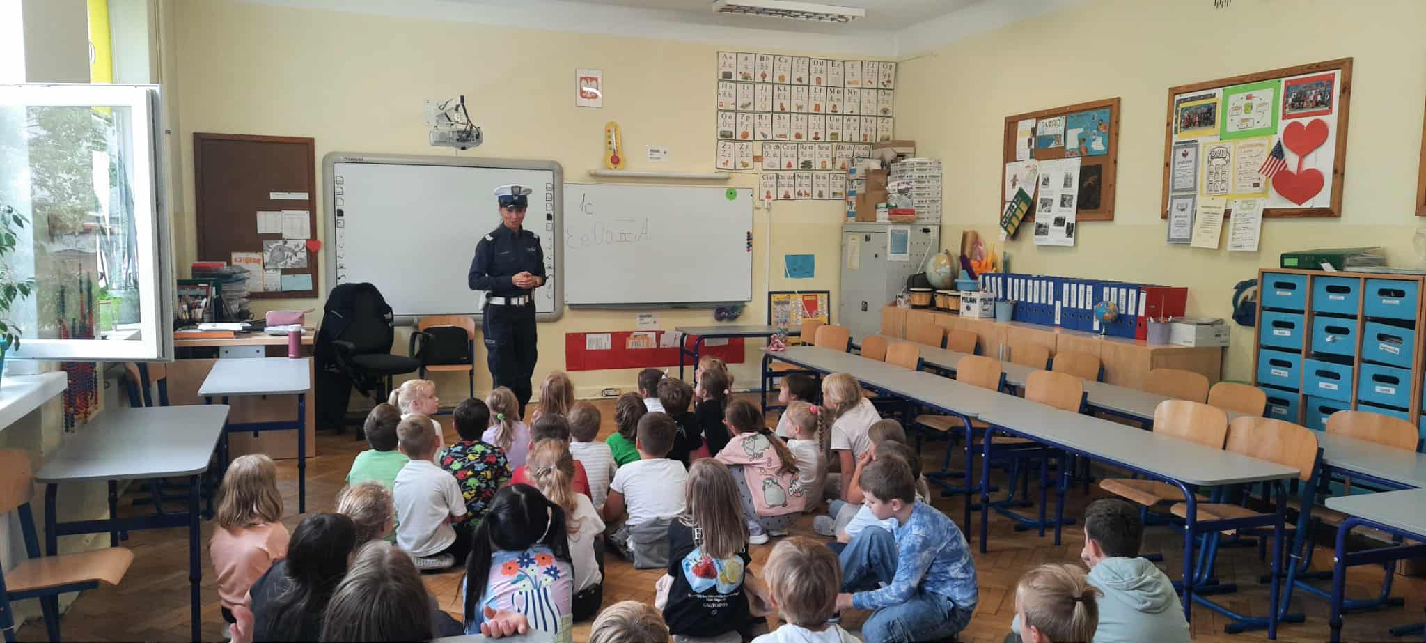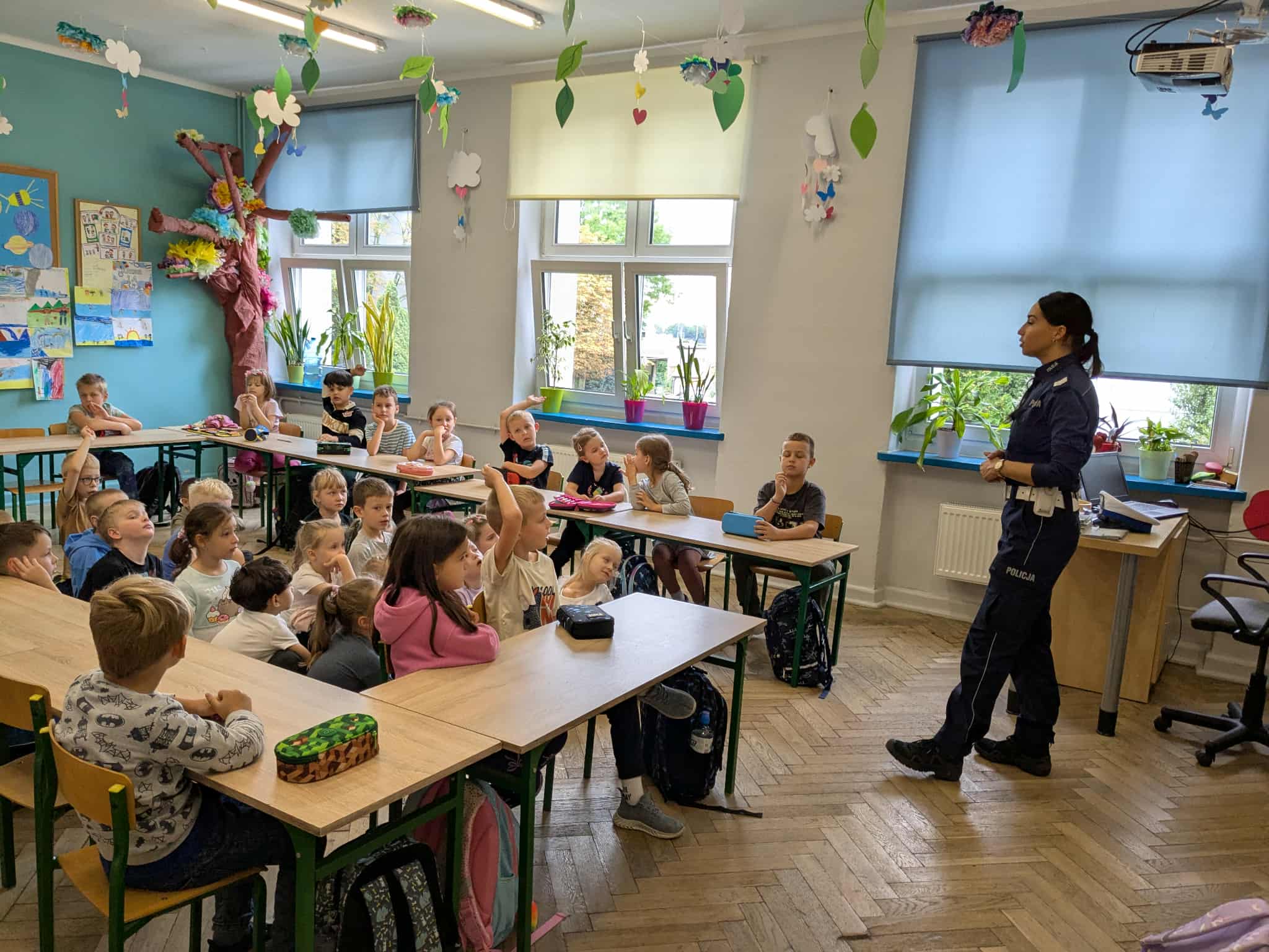 Powtórzyli wiadomości na temat zasad przechodzenia przez jezdnię – obligatoryjnie na przejściu dla pieszych, na zielonym świetle i zachowaniu zasady ograniczonego zaufania do kierujących pojazdami. Podkreślono znaczenie noszenia elementów odblaskowych na odzieży i plecaku szkolnym oraz uzasadniono konieczność rozglądania się przed wejściem na pasy w lewo, prawo, lewo. Uczniowie pogłębili także wiedzę na temat bezpieczeństwa podczas jazdy samochodem – koniecznie w pasach - na rowerze czy hulajnodze. Pani policjantka podkreślała znaczenie posiadania kasku na głowie, obowiązkowego przeprowadzania roweru/hulajnogi przez pasy oraz konieczność obowiązkowego wyposażenia roweru. Są to: dzwonek, co najmniej jeden działający hamulec, elementy odblaskowe, światło białe z przodu i czerwone z tyłu. Ciekawostką była informacja, że dźwięk dzwonka przy rowerze nie może być drażniący, by nie przestraszyć np. psa, który ze strachu może zaatakować. Dzieci dowiedziały się także, że kartę rowerową mogą wyrobić dopiero mając 10 lat i by ją osiągnąć muszą zdać egzamin pisemny i ustny. Całe spotkanie było bardzo ciekawe, uczniowie mieli możliwość zadawania pytań oraz dzielenia się własnymi doświadczeniami. Dopełnieniem atrakcyjnego spotkania była unikalna możliwość oględzin radiowozu.