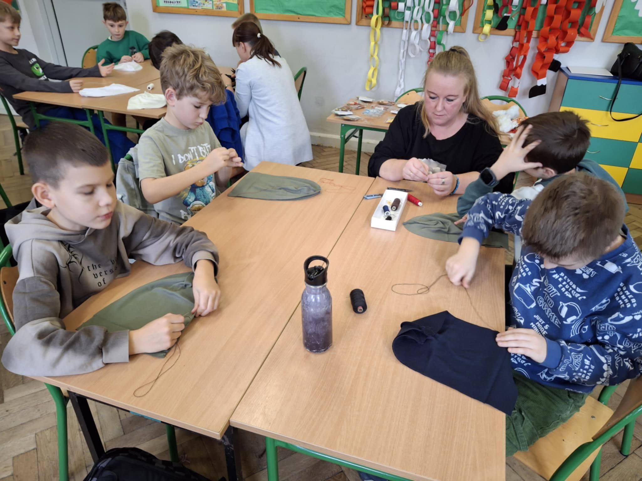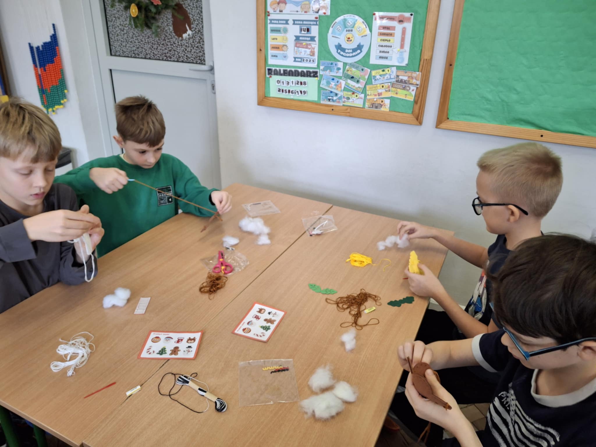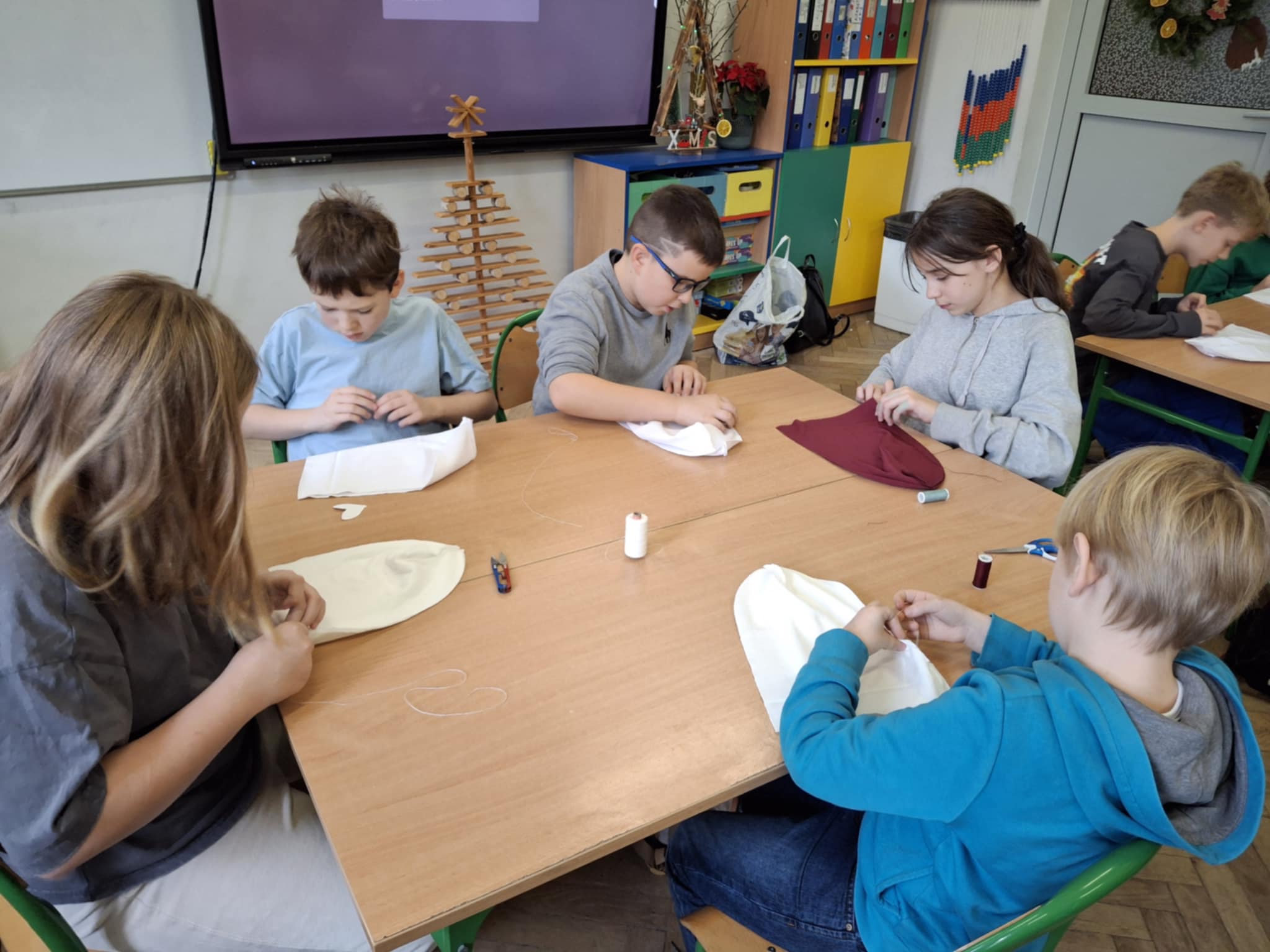 Rozpoczęliśmy od filcowych zestawów ozdób świątecznych, by powoli oswajać się z igłą. przyjemność jednak przyniosło nam własnoręczne uszycie swoich czapek. To była wyjątkowa lekcja, dzięki której inaczej będziemy patrzeć już na ubrania w sklepach.