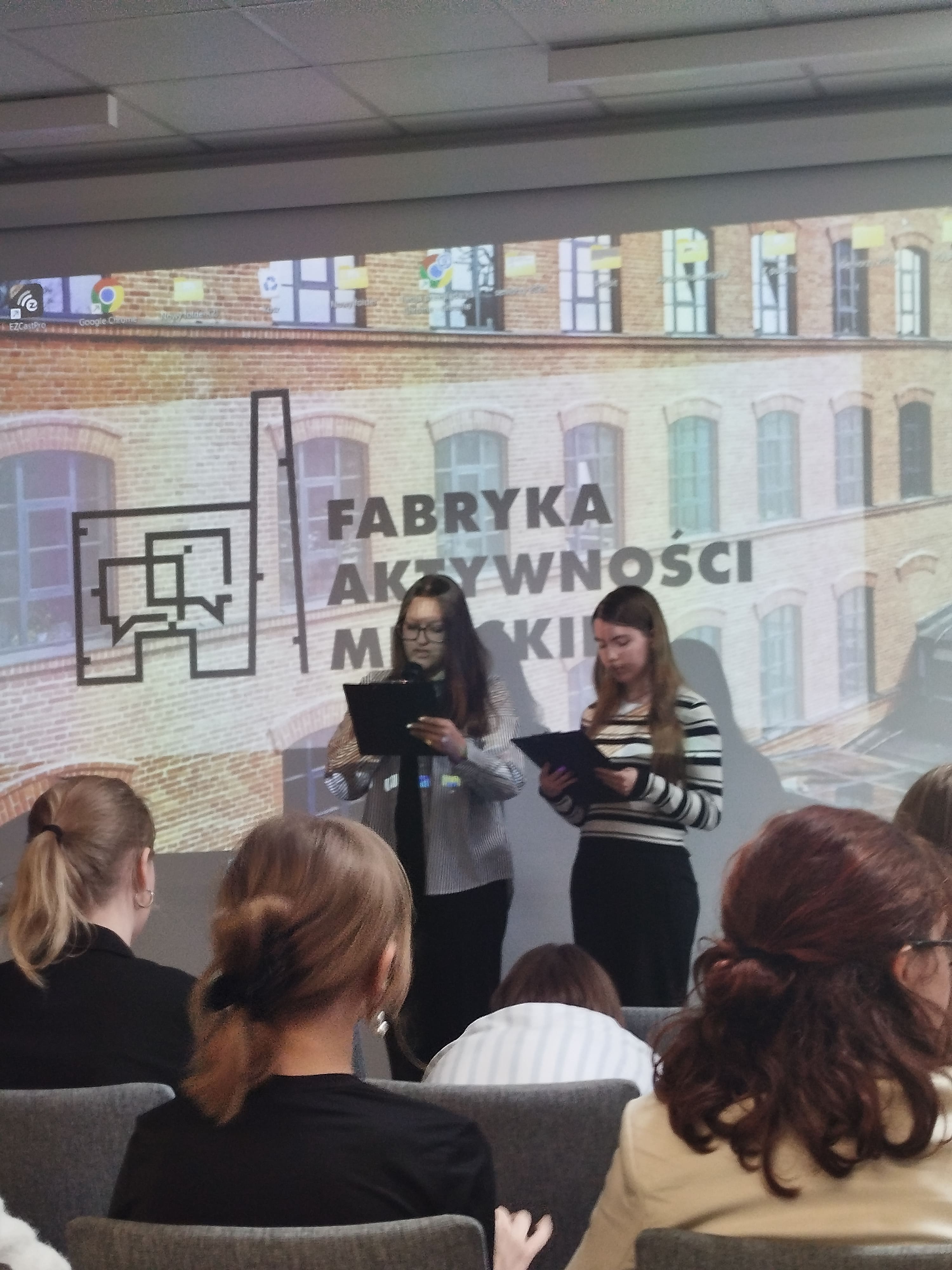 Młodzi ludzie ze szkół podstawowych przedstawiali swoje pomysły na szkołę przyjazną uczniom. Laura i Maja wygłosiły przemówienie na temat tego, czy można uczyć się przez zabawę. Ich wystąpienie było niezwykle merytoryczne, poparte zdjęciami projektów wykonanych przez uczniów naszej szkoły. Serdecznie gratulujemy pomysłu i odwagi!