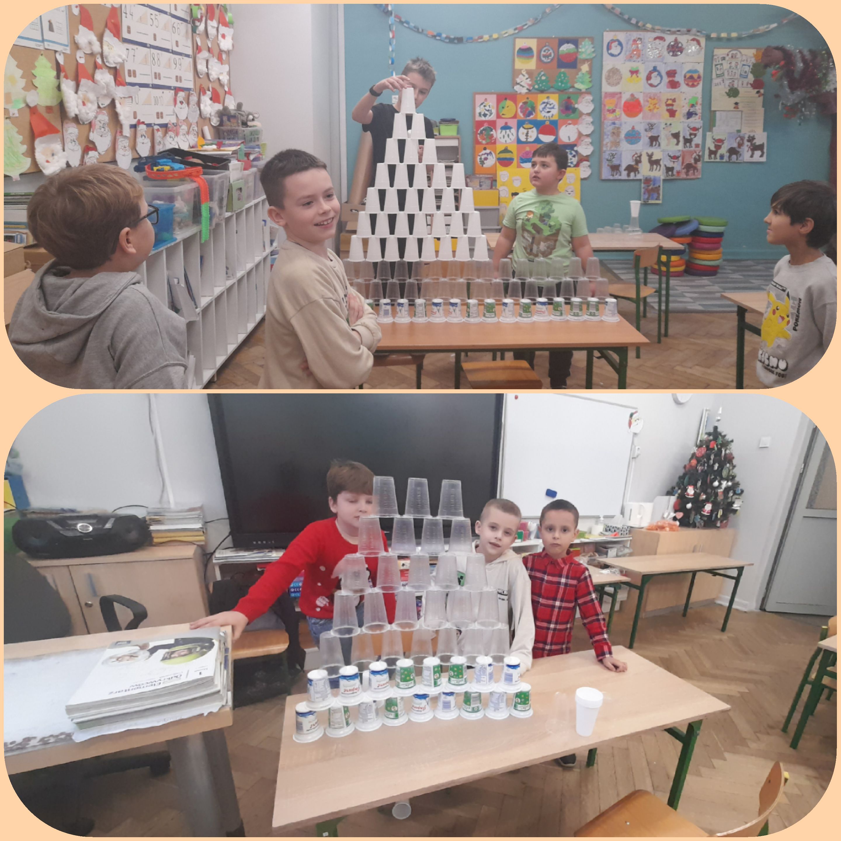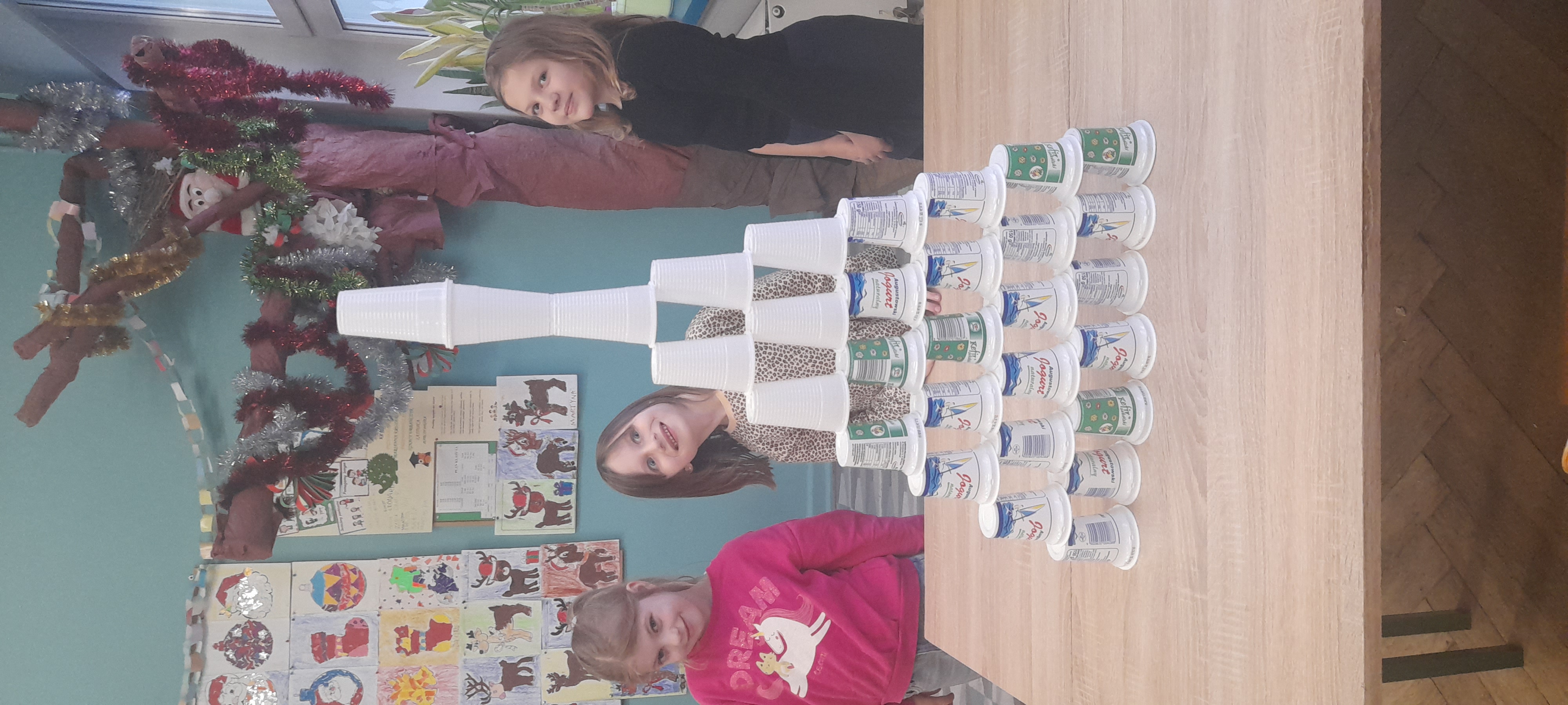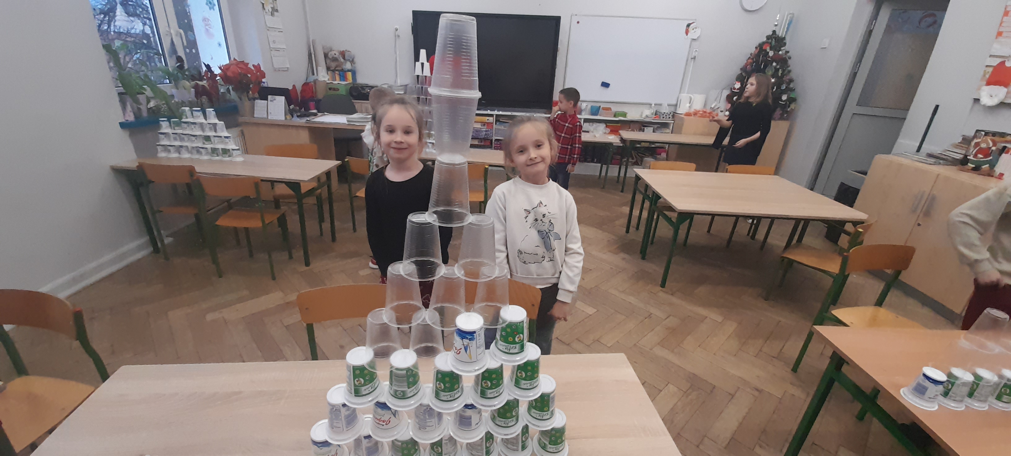 Dzieci zostały podzielone na trzyosobowe drużyny. Zadaniem każdej z drużyn było zbudowanie jak najwyższej wieży z kubków. Każda drużyna miała do dyspozycji taką samą ilość kubków oraz możliwość dobierania ich w trakcie zabawa. Dzieci miały jedną możliwość powtórzenia budowli. Drużyna zwycięzców otrzymała nagrodę, a pozostali uczestnicy nagrodę pocieszenia.